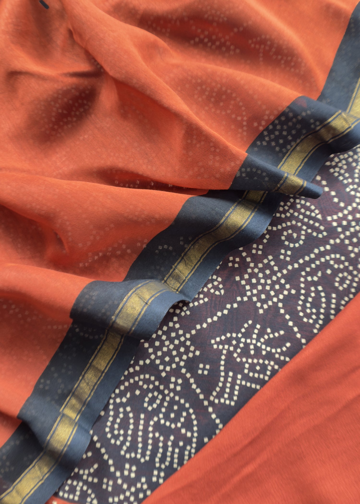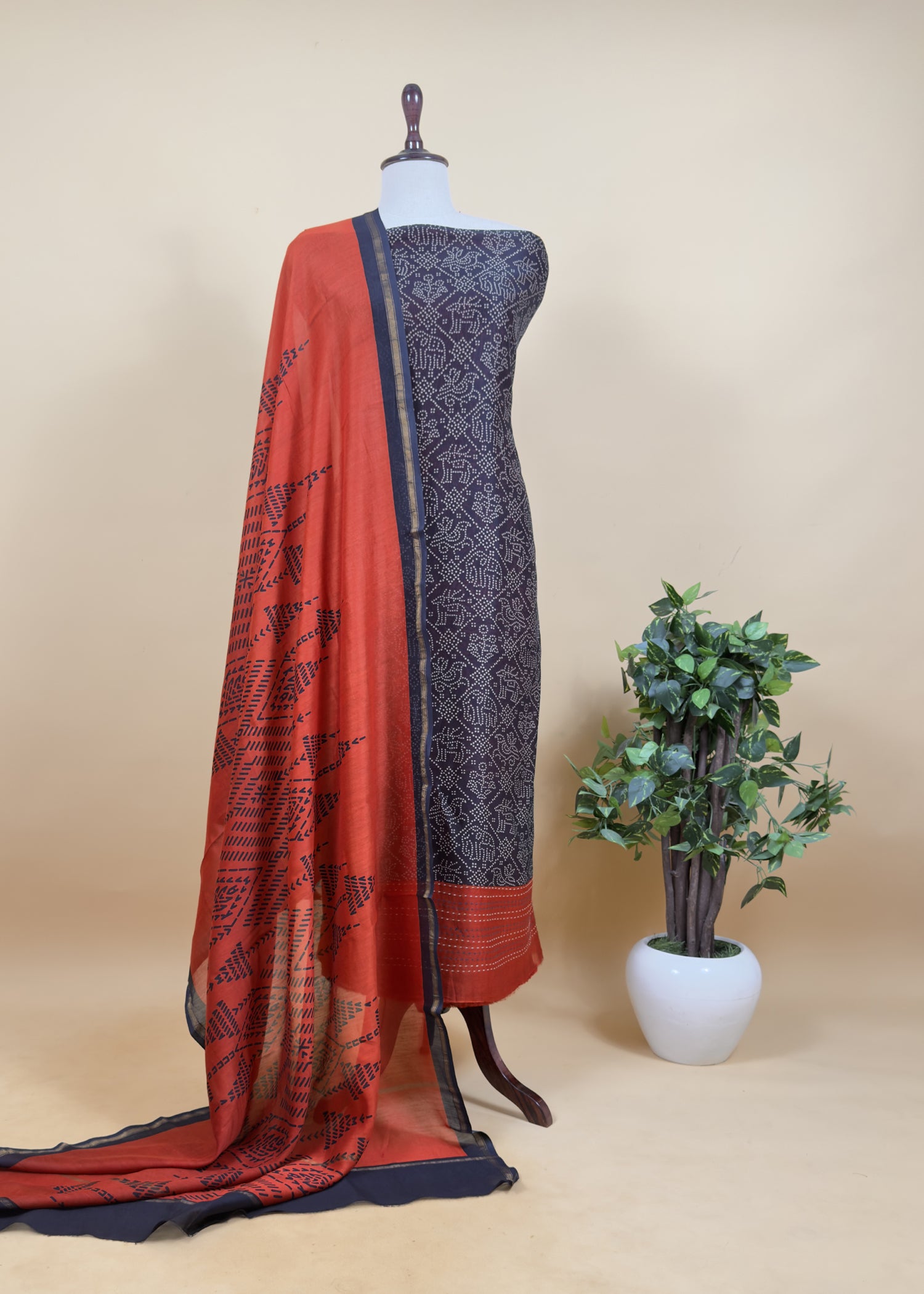 A hand-block printed blue and burnt orange Maheshwari silk suit featuring Bandhani and Kantha work on the kurta, paired with a hand-block printed dupatta in pure Maheshwari silk. This three-piece suit comes with a pure satin cotton bottom.