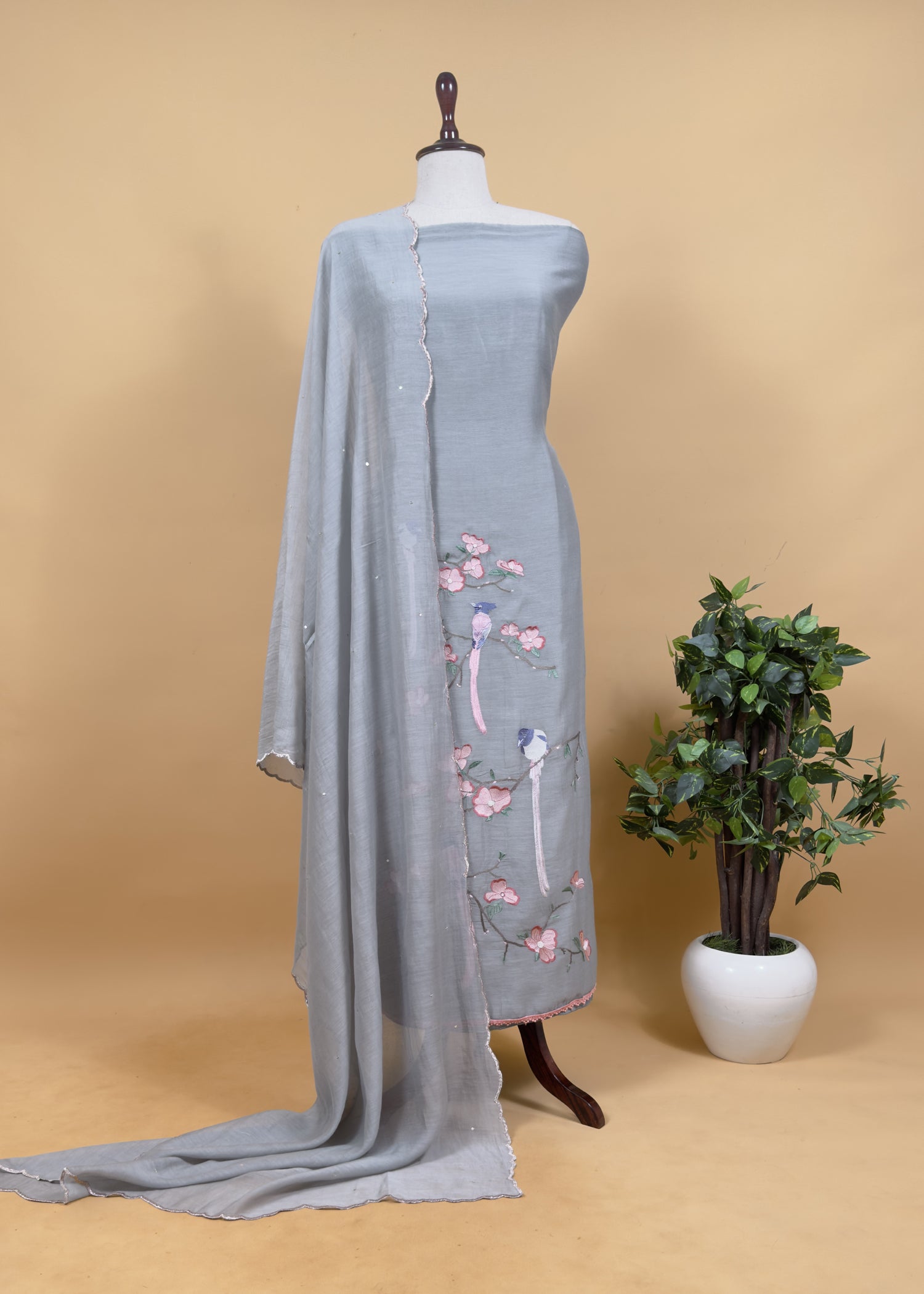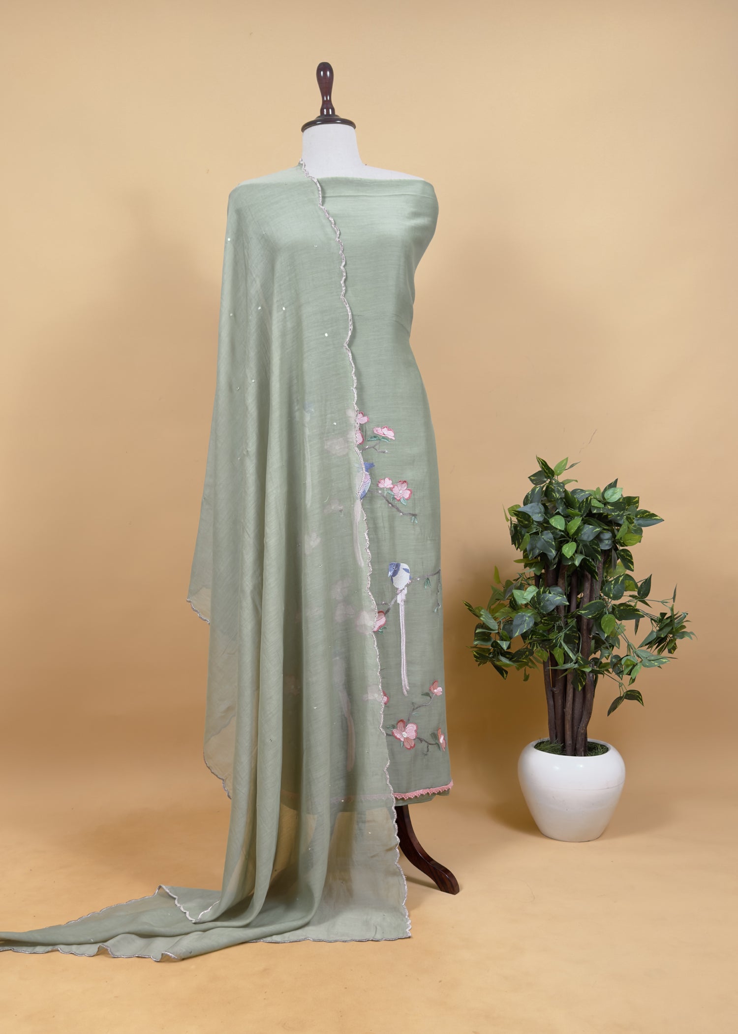 Shop summer exclusive pure mul kurta adorned with beautiful parrots Resham embroidery adorned with pearls and laces, pure mul dupatta with minimal sequin work and gold scalloping. The three-piece suit comes with matching cotton satin lowers.