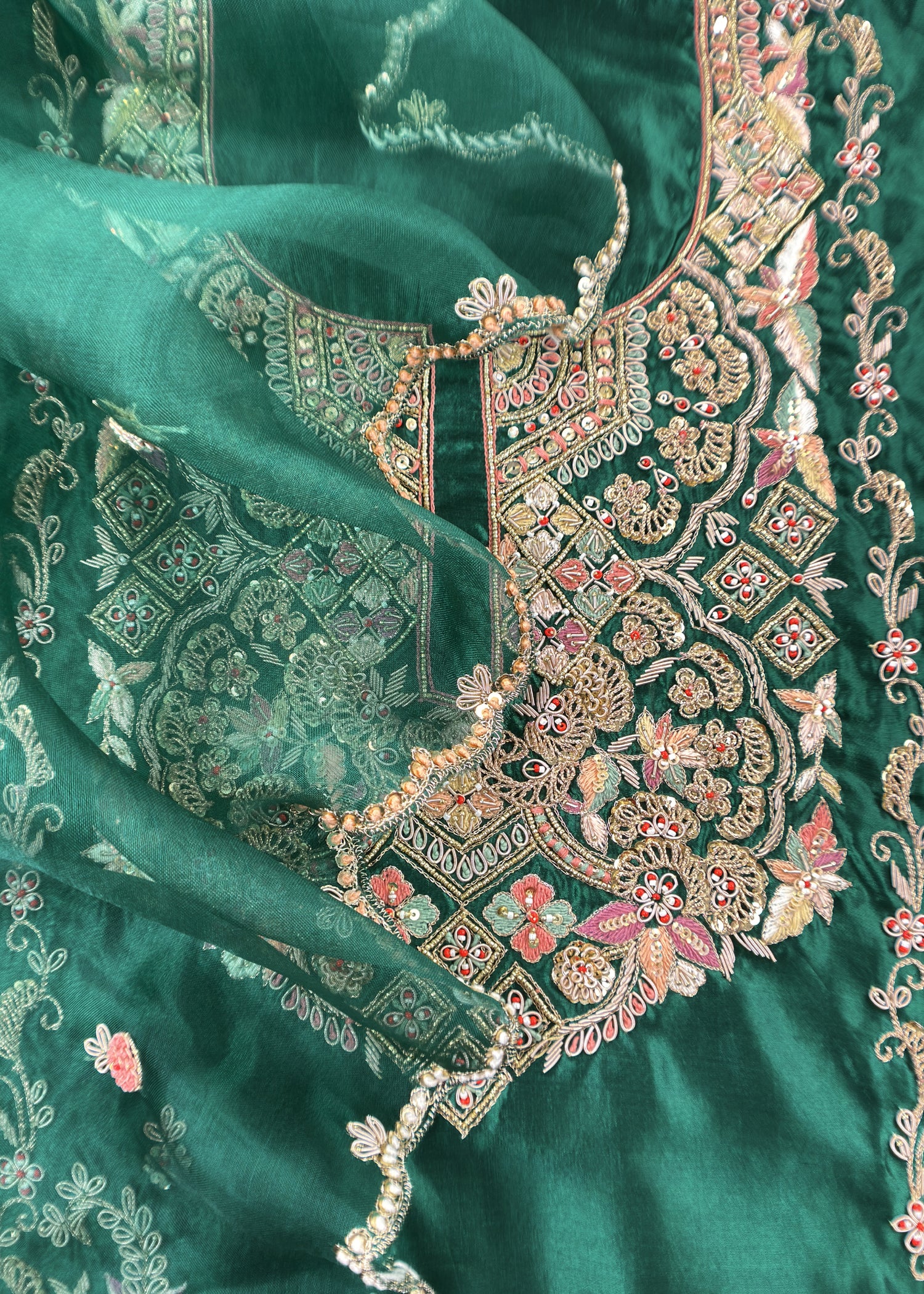 Bottle Green Handloom Silk Suit With Zardosi Embroidery