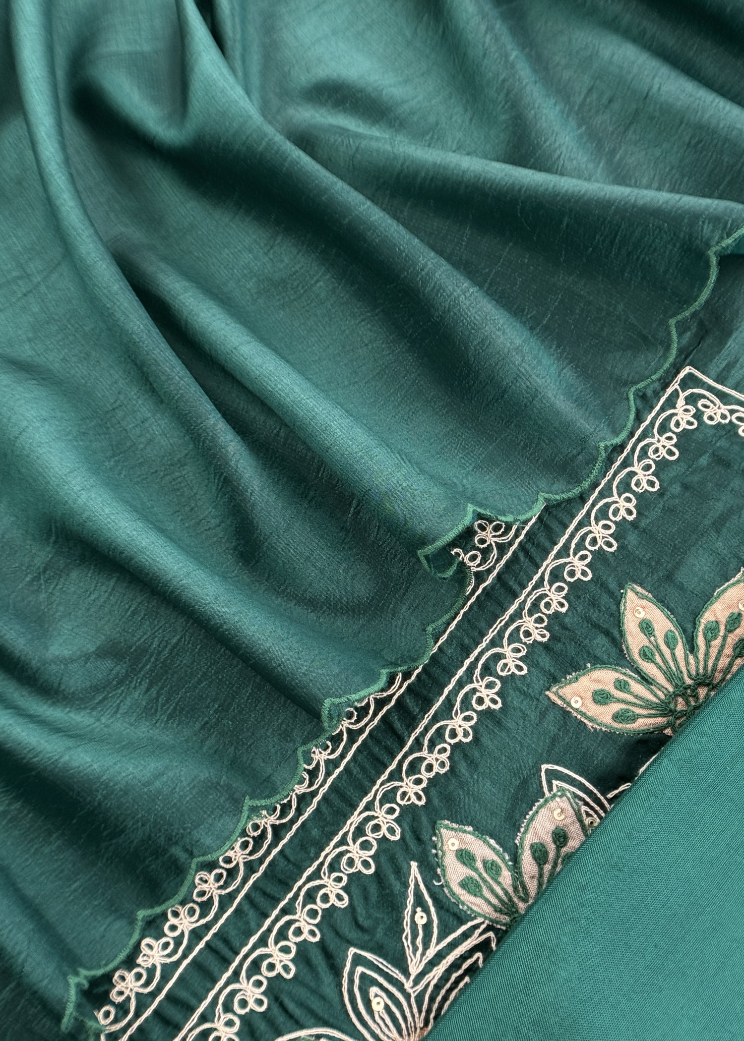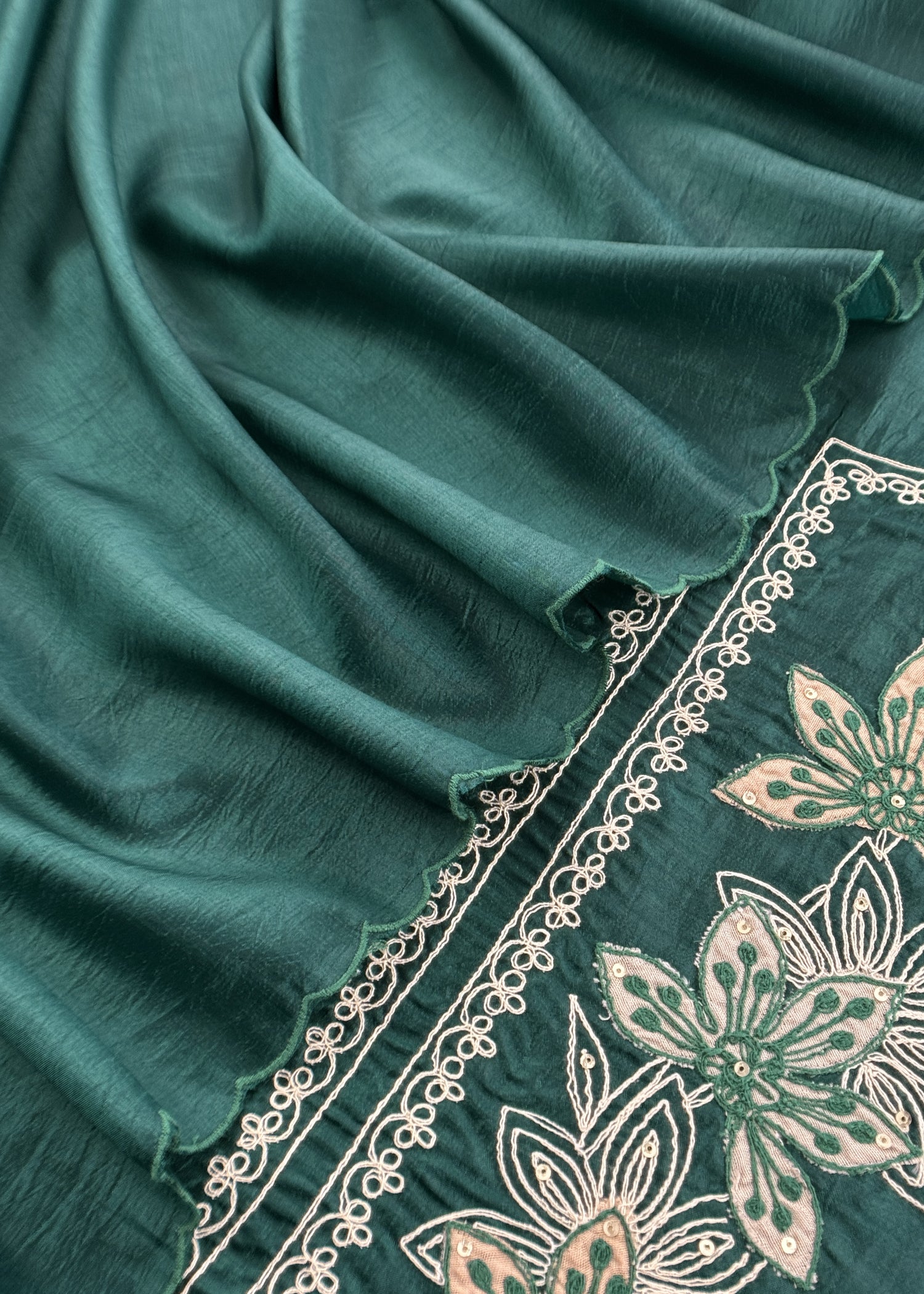 Bottle Green Satin Silk Suit Fabric With Dori And Zardosi Embroidery