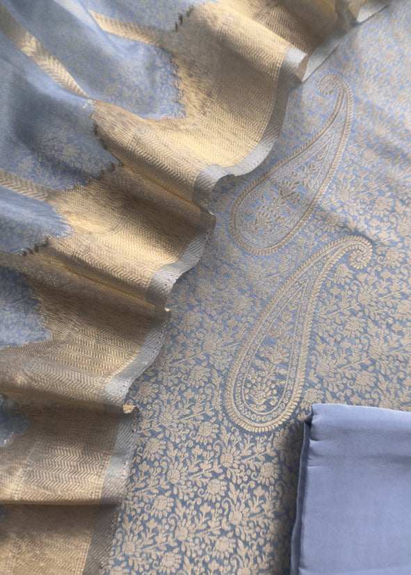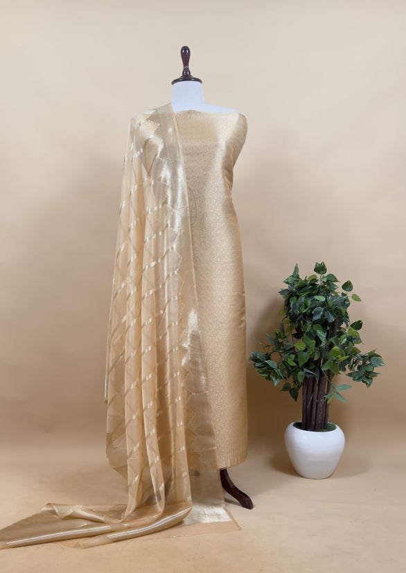 The wedding wear three-piece suit has brocade kurta and organza Dupatta adorned with beautiful golden zari work along with plain crepe bottom.