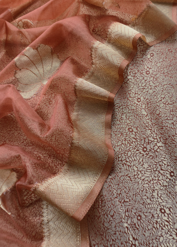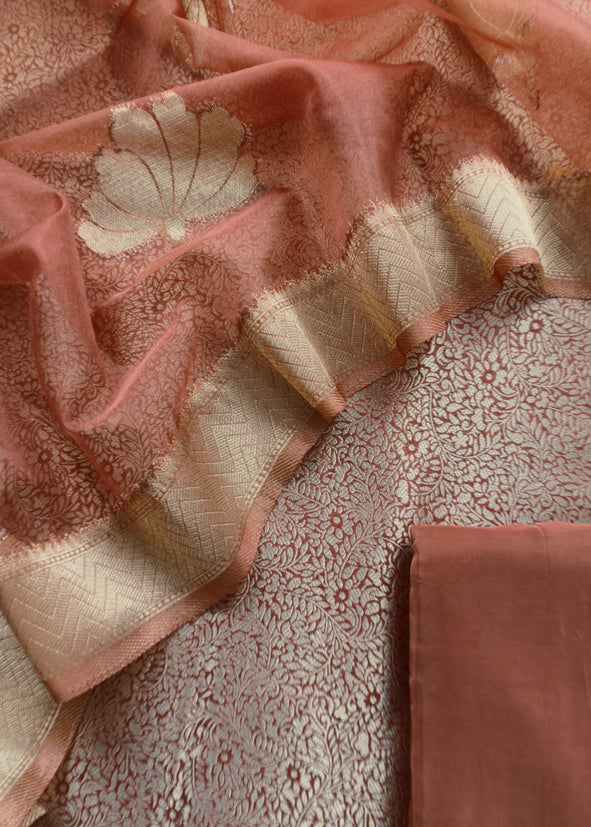 The wedding wear three-piece suit has brocade kurta and organza Dupatta adorned with beautiful golden zari work along with plain crepe bottom.