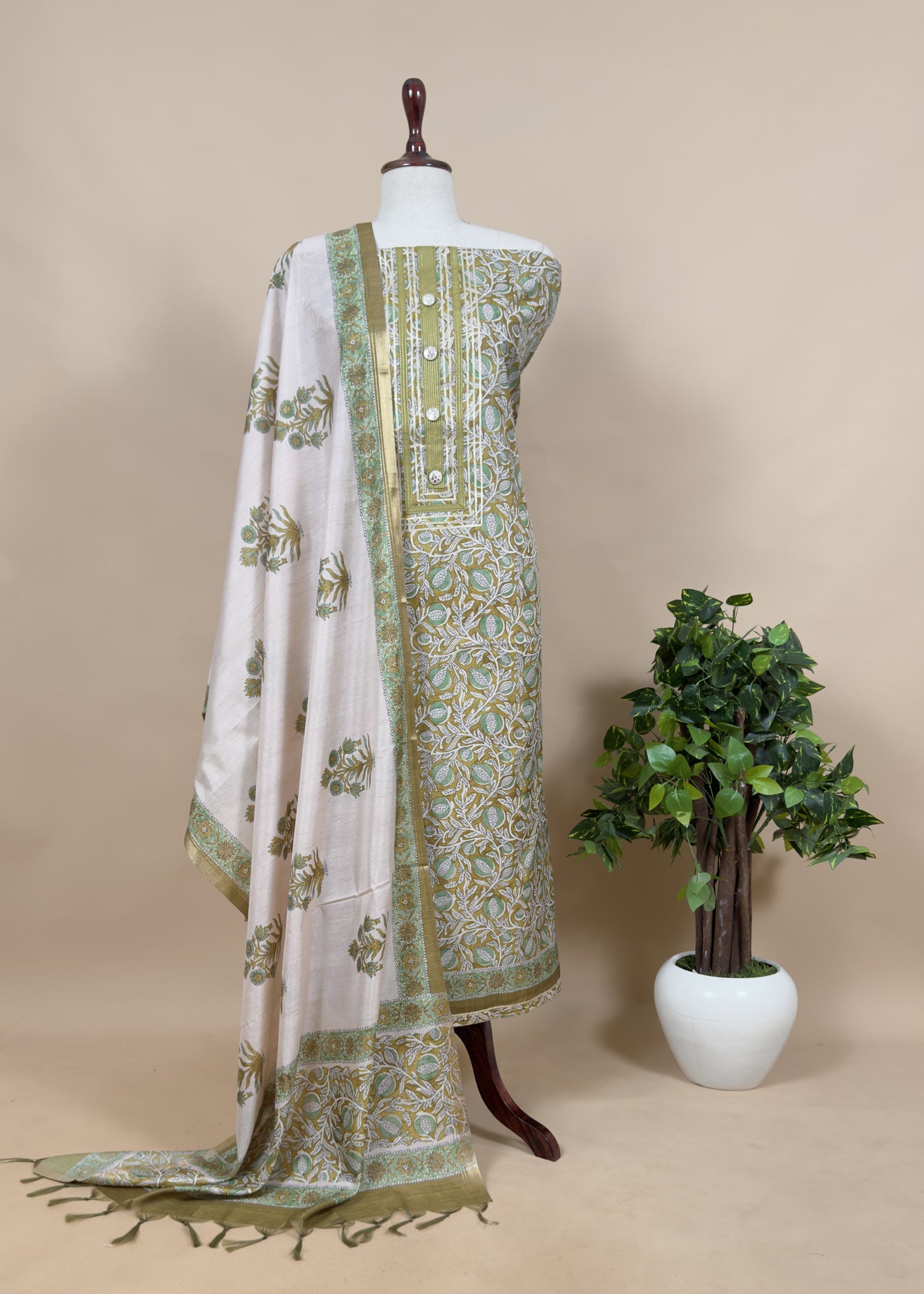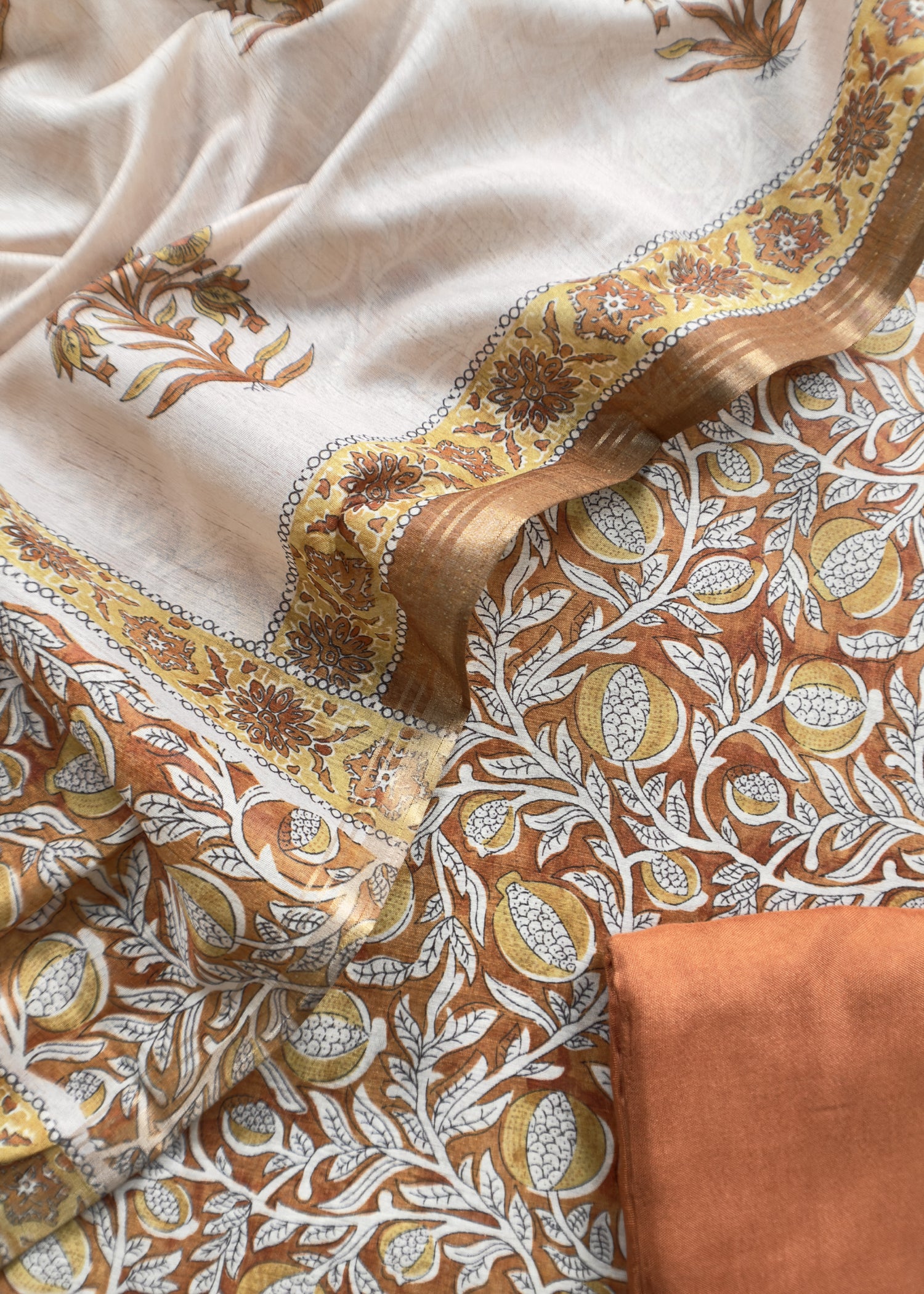 Brown Hand Block Print Unstitched Suit In Chanderi