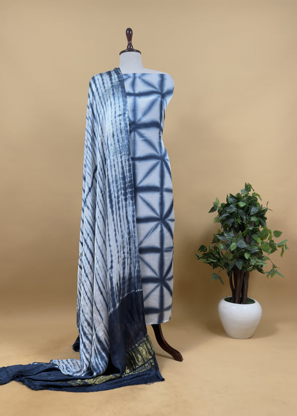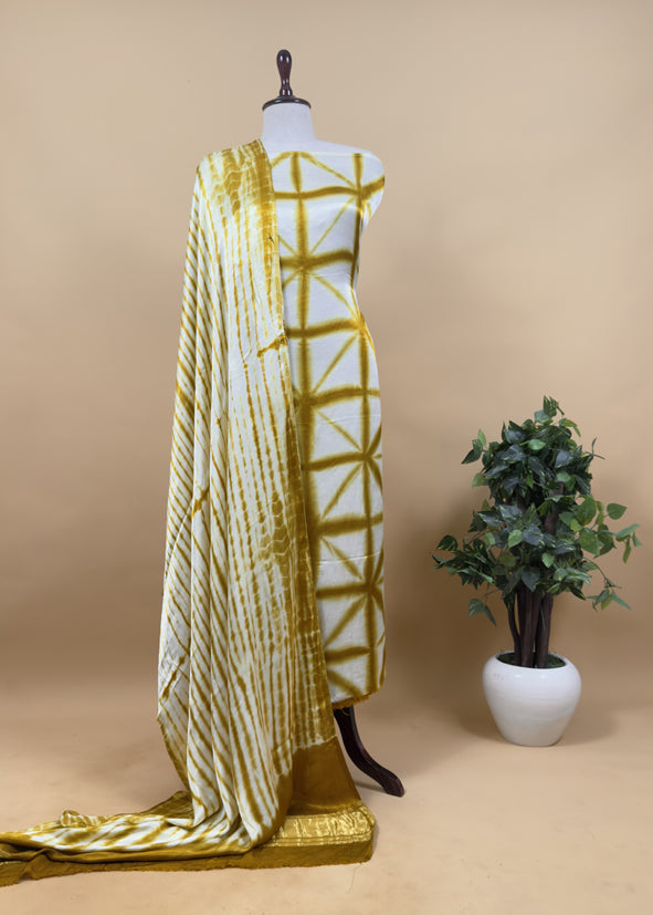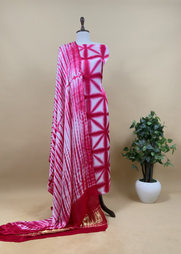 Enjoy the craftsmanship and age old traditions of shibori hand dyeing techniques on pure Gajji silk three piece suit with gold lakdi-patta pallu borders. The suit comes with matching cotton satin lowers.