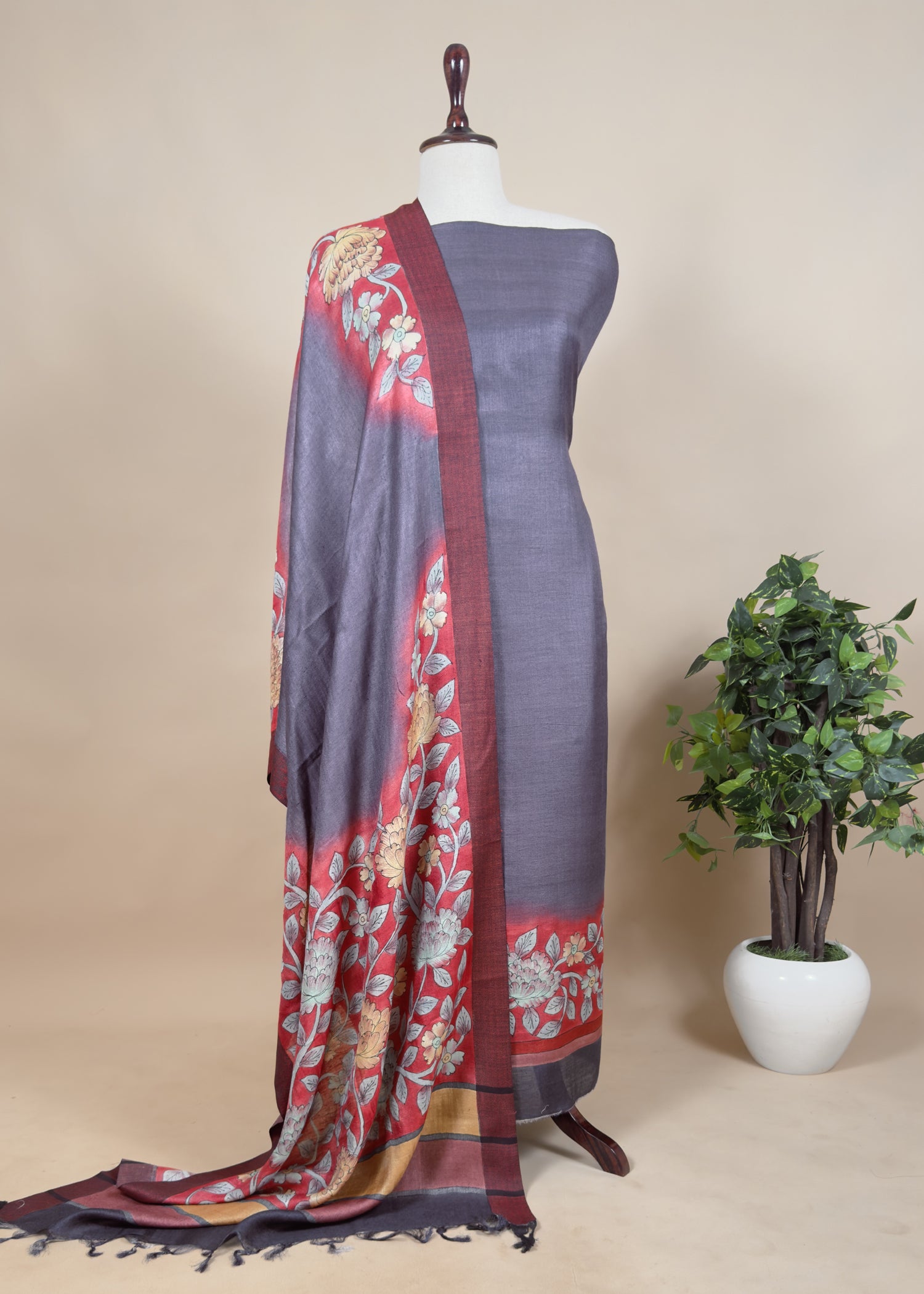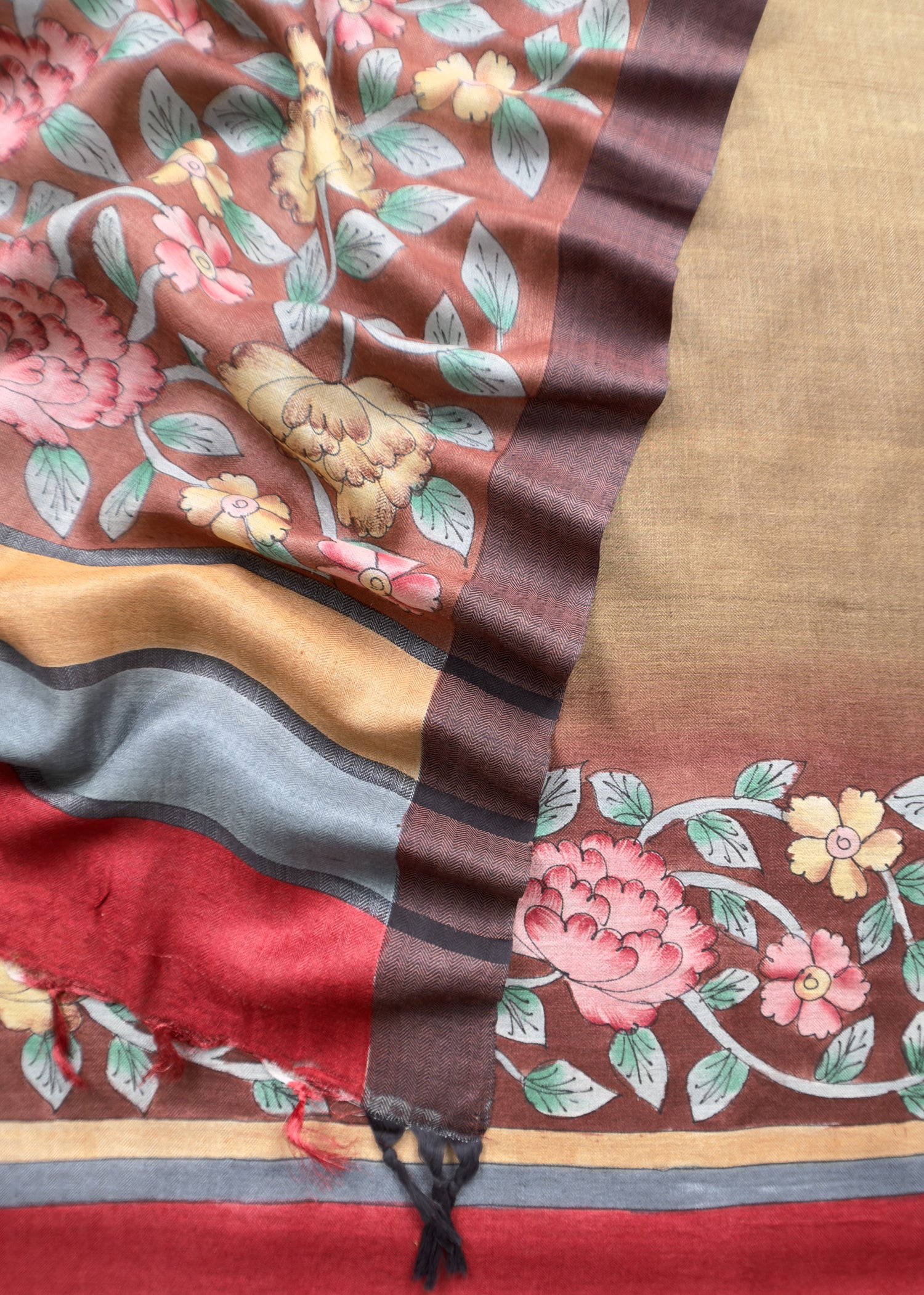 Brown Handloom Pashmina Suit With Hand Painted Kalamakari