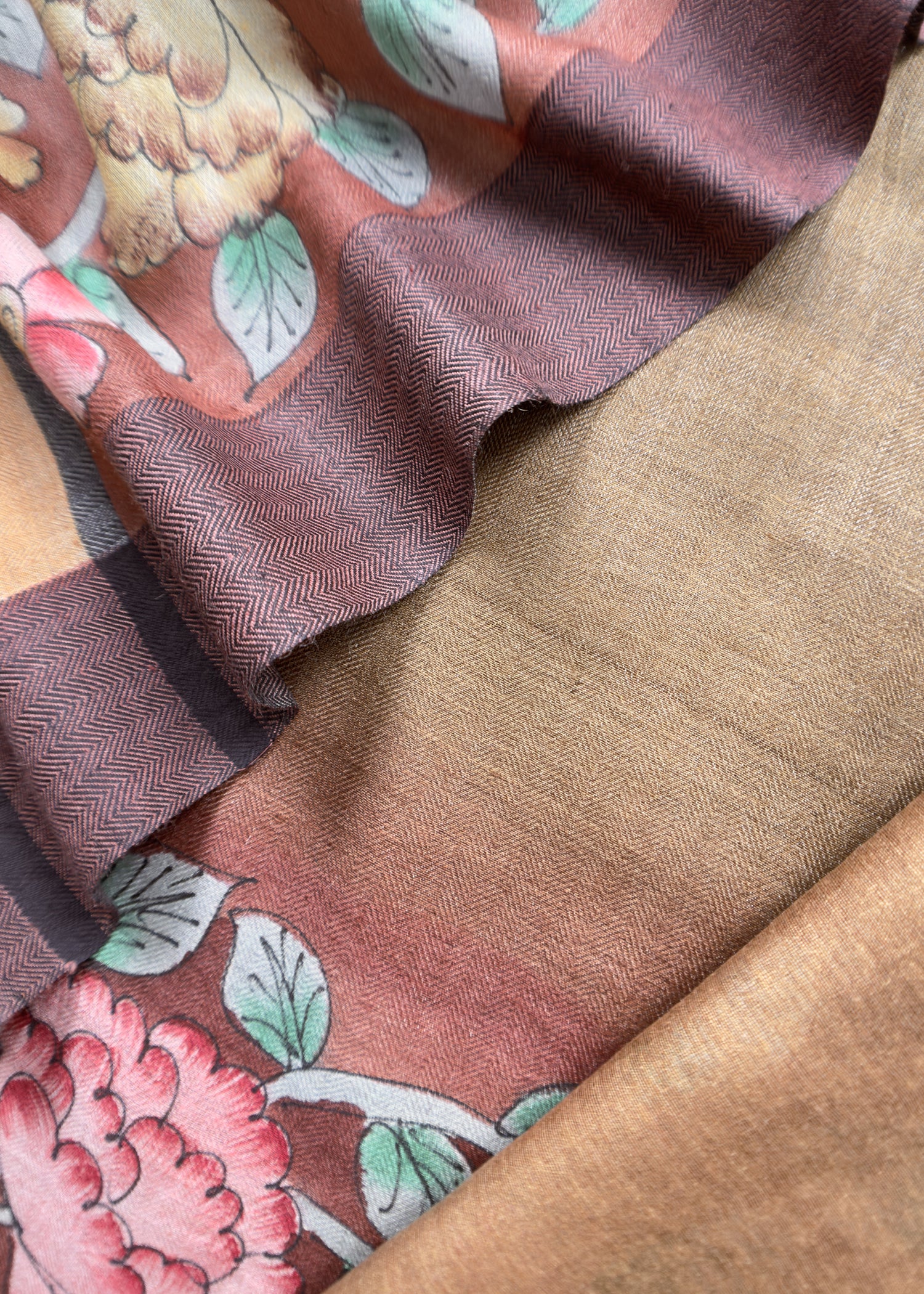 Presenting you our hand-painted Kalamkari collection from Kalasheel winter edit featuring pashmina kurta with hand-painted Kalamkari phool ghera paired with all over double shade pashmina dupatta with hand-painted Kalamkari phool brush print all over it. The suit comes with fine-quality matching lowers.