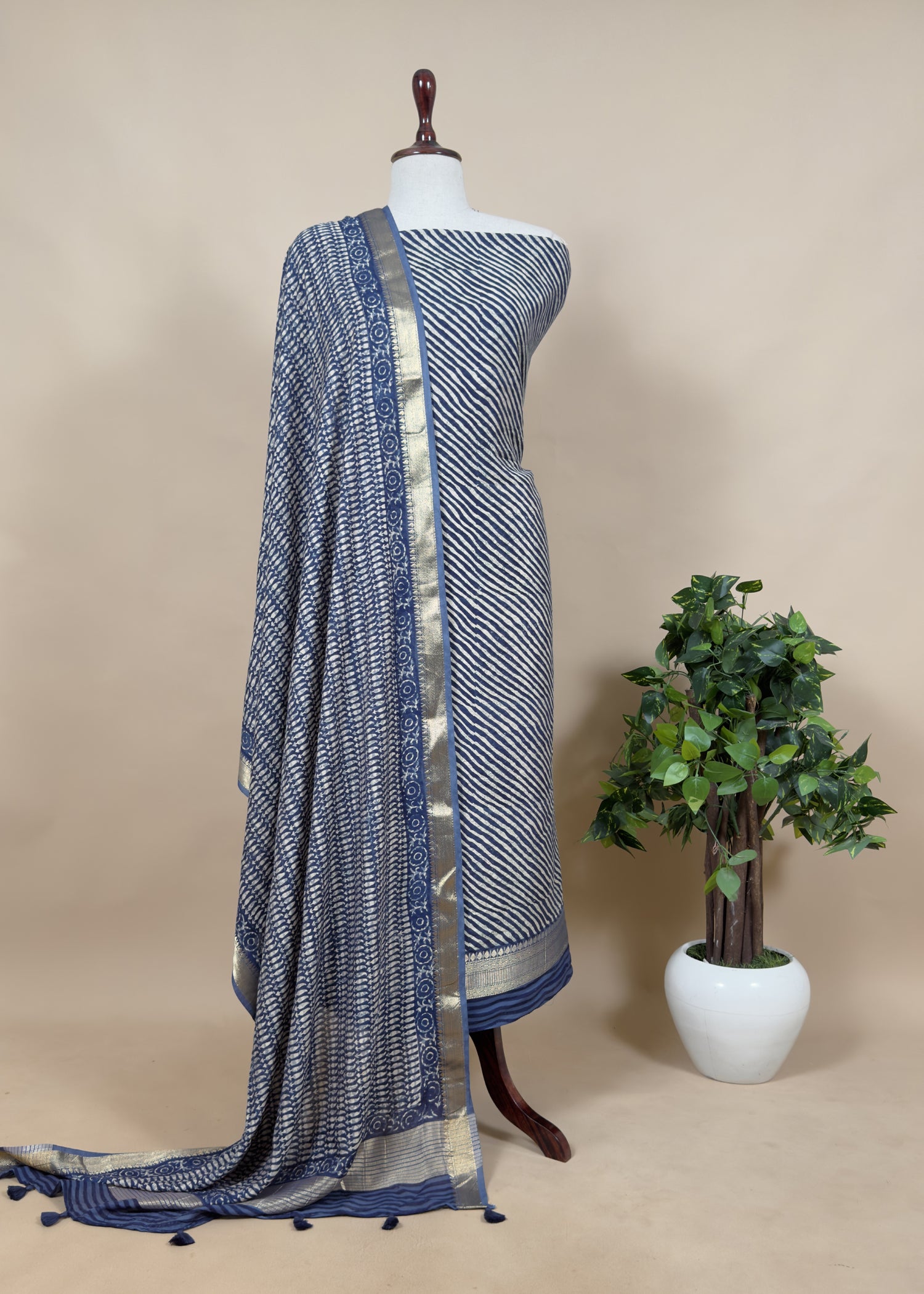 A three-piece suit crafted from pure modal fabric, featuring hand-blocked Lehariya and a Maheshwari zari border on the kurta and dupatta, with handmade tassels on both ends of the dupatta. The set includes pure satin cotton bottom, ensuring both comfort and sophistication.