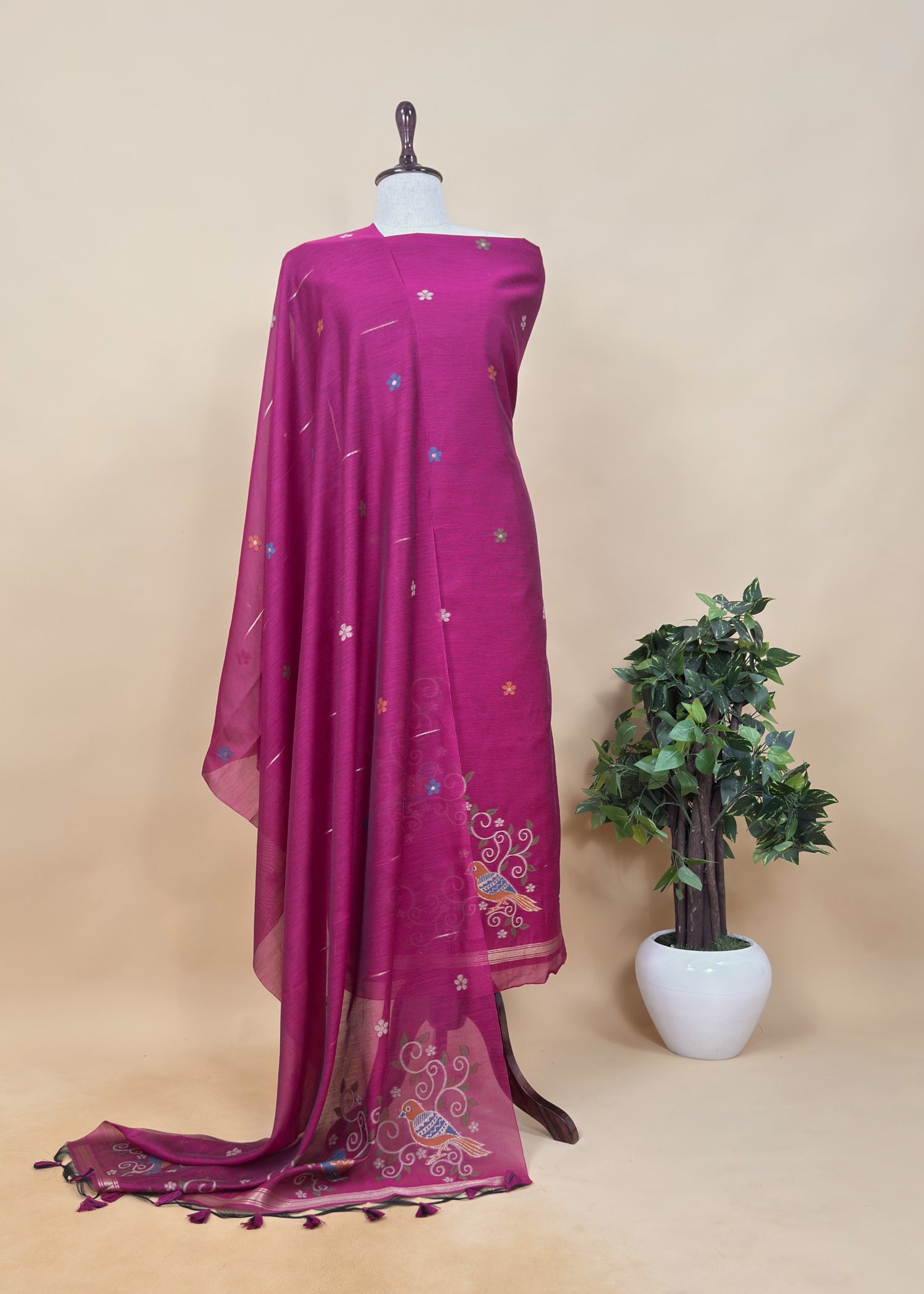 This exquisite Linen Chanderi suit features elegant chidiya weaving on the kurta, beautifully complemented by intricate Jamdani work all over the kurta and dupatta. Handmade tassels on both ends of the dupatta add unmatched traditional charm. The three-piece suit comes with a plain bottom.