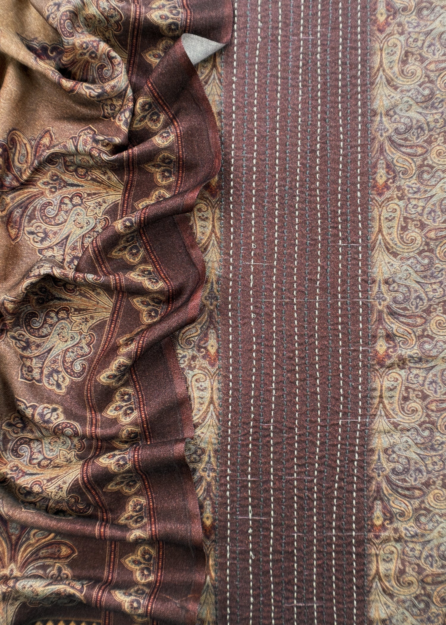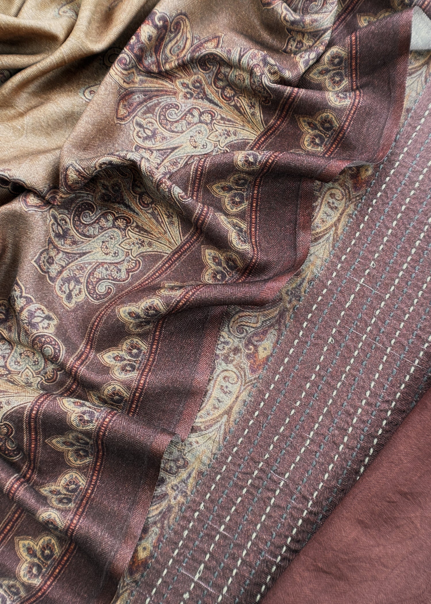 Brown Winters Spun Pashmina Digital Print Suit Fabric With Kantha Embroidery