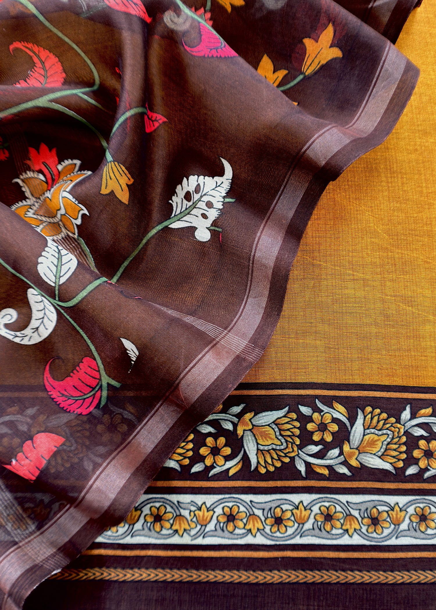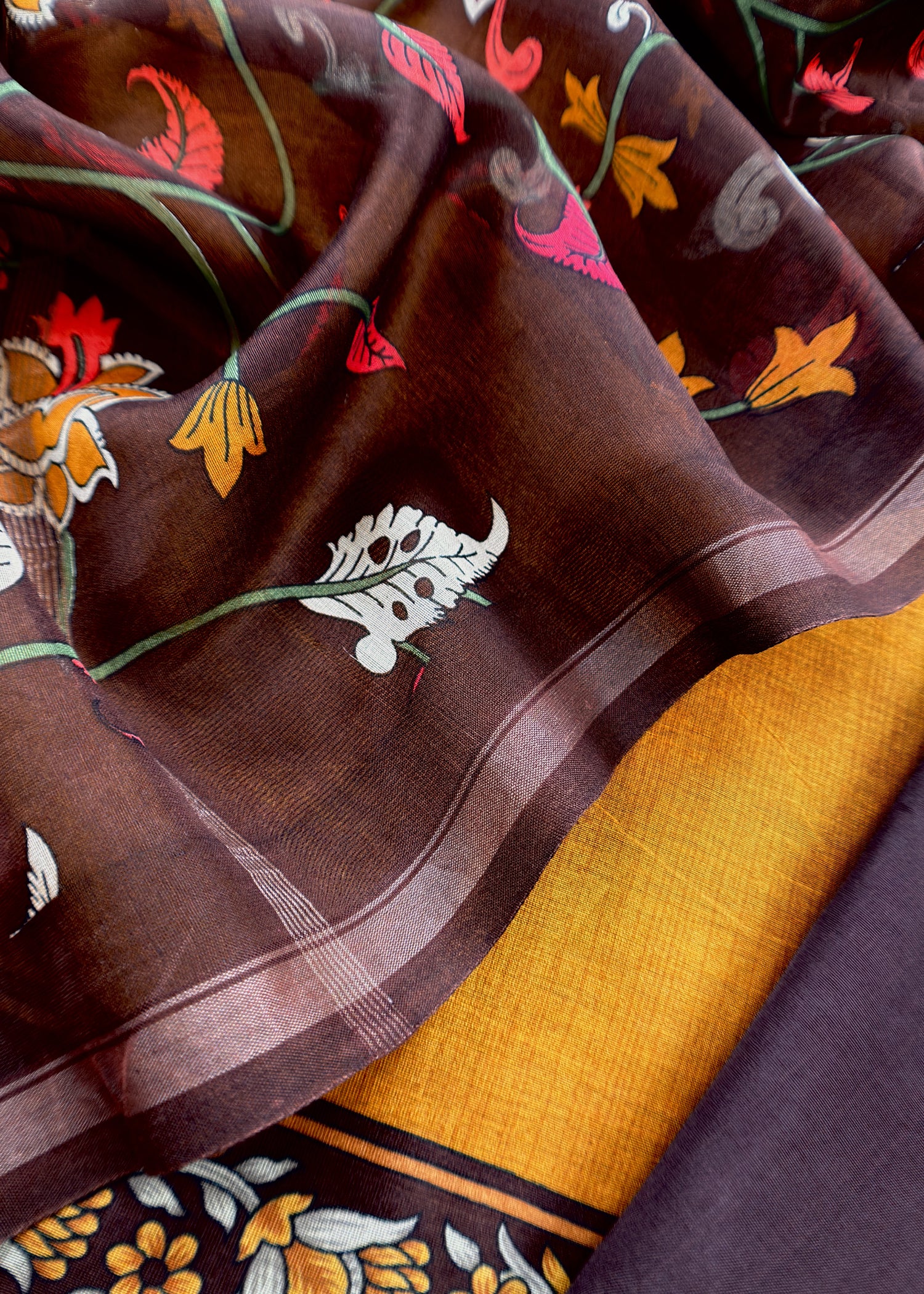 Caramel And Brown Kalamkari Print Pure Maheshwari Silk Suit With Dupatta