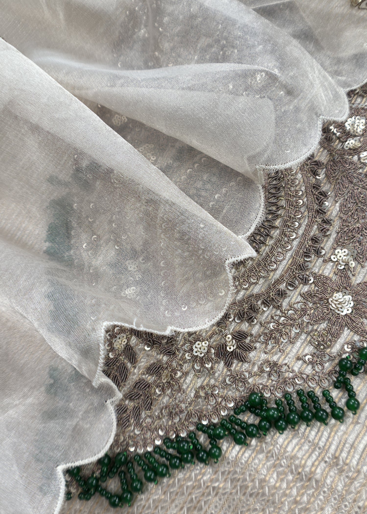 Ultimate luxury handcrafted in 90 days by the skilled artisans of Kolkata perfectly complimenting Indian tones. Handloom tissue silk kurta, matching silk lowers and handloom tissue silk dupatta with scalloping, adorned with oxidised zari premium Dori, dabka, zardosi handwork with wool detailings on the neckline, sleeves, with minimal handwork bootis on dupatta.
