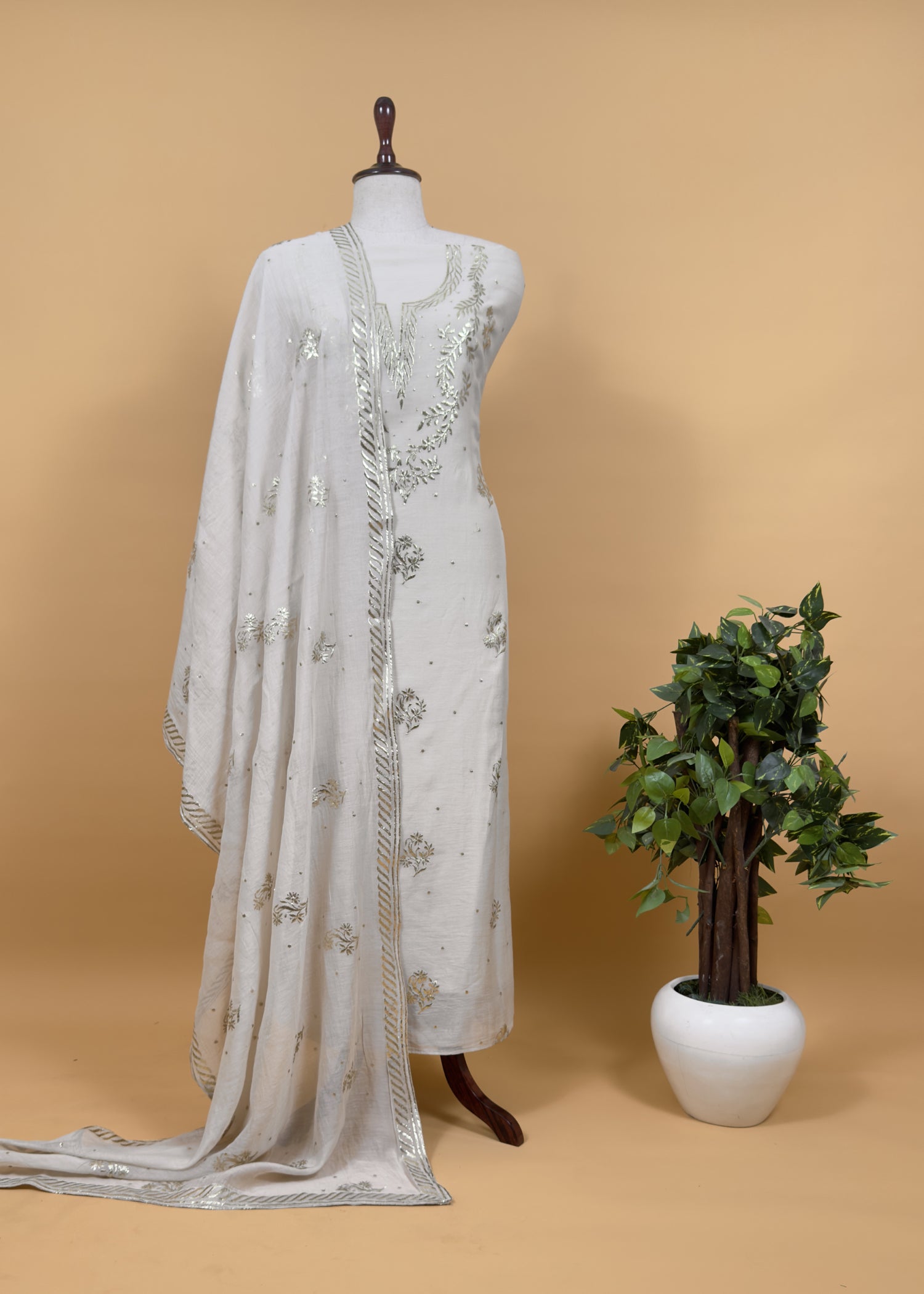 Stunning kurta and dupatta in pure mul chanderi fabric showcasing lakhnavi craftsmanship of pitta hand work on the neckline, front panel, all over bootis, and dupatta borders. The three-piece suit comes with matching cotton satin lowers.