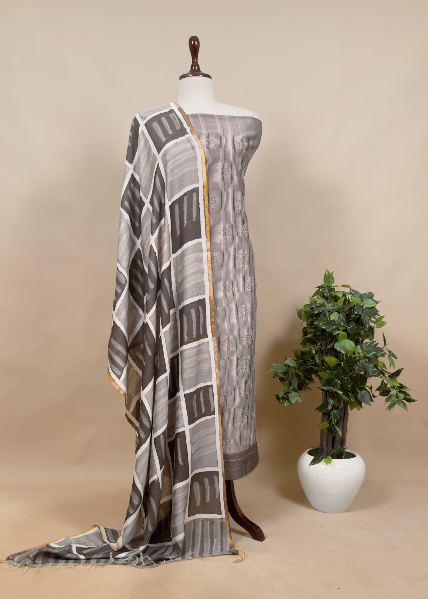 Get your hands on versatile and elegant three piece suit fabric in pure Chanderi fabric kurta and dupatta with natural dabu hand block print in unique designs with self Resham embroidery on the kurta. The suit comes with matching cotton bottom.