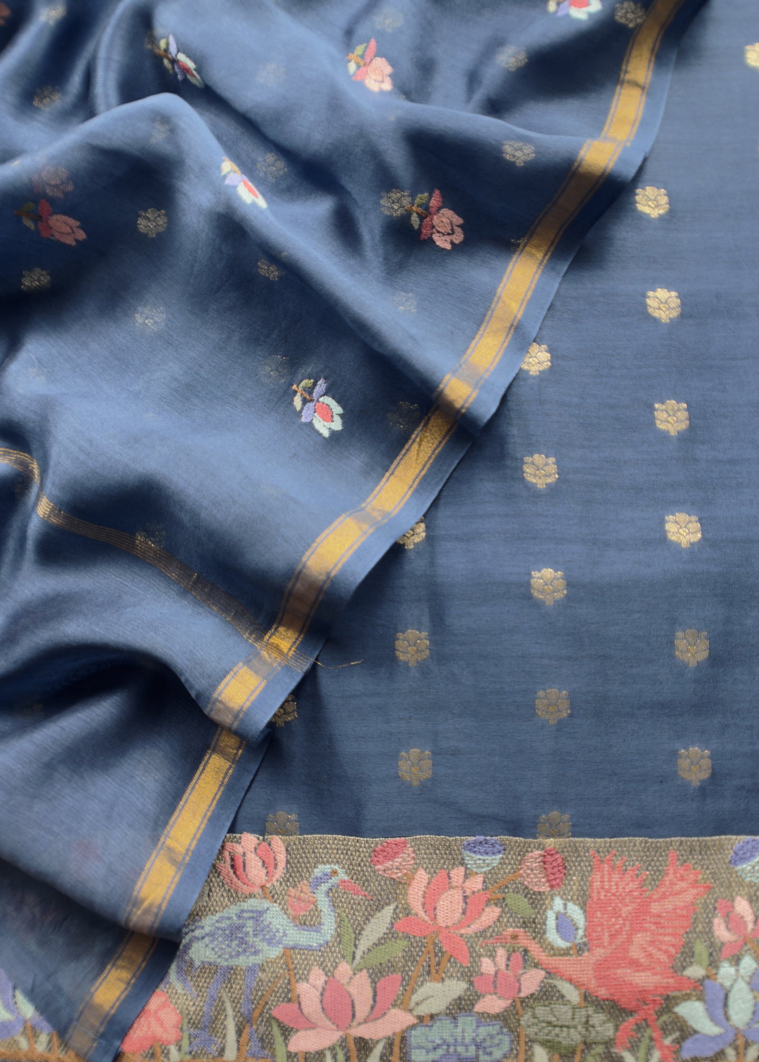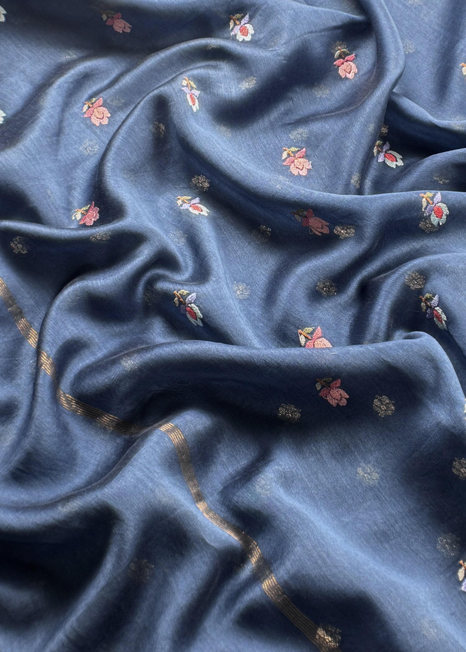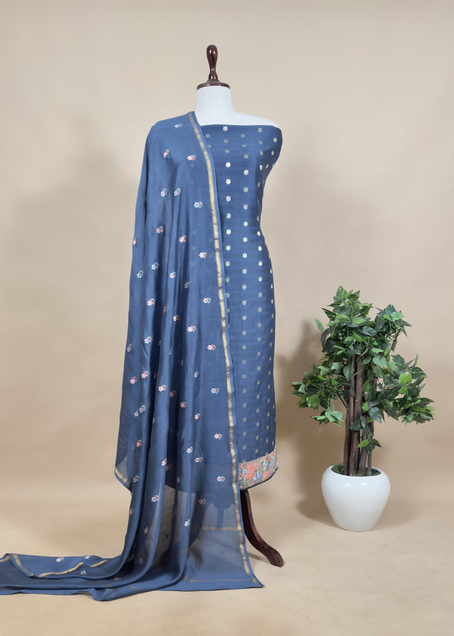 Classic Blue Handloom 70gm Chanderi Unstitched Suit Set With Multicolour Embroidery