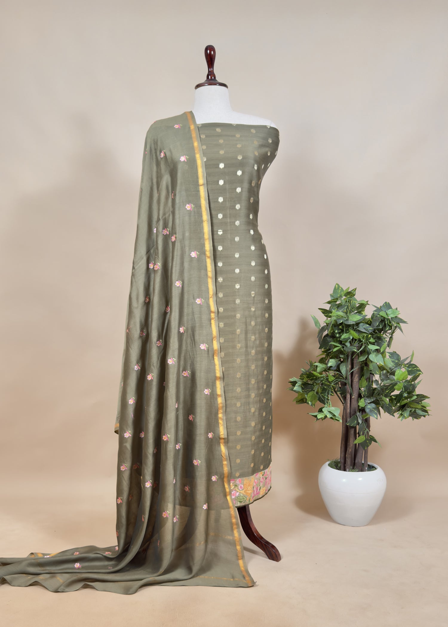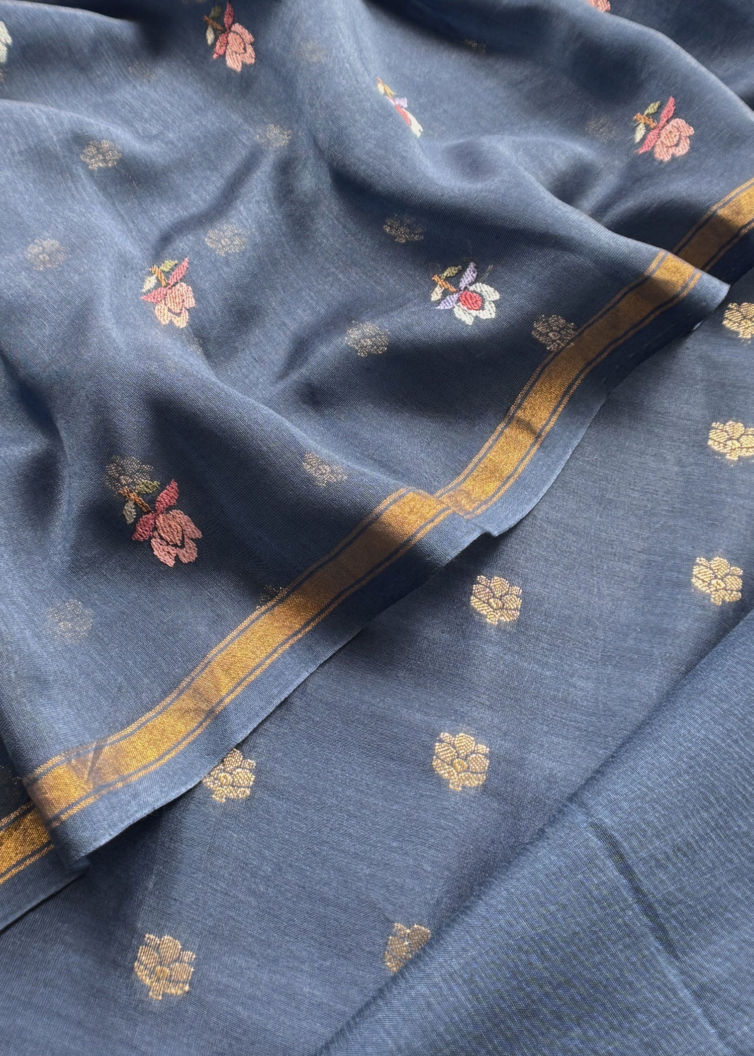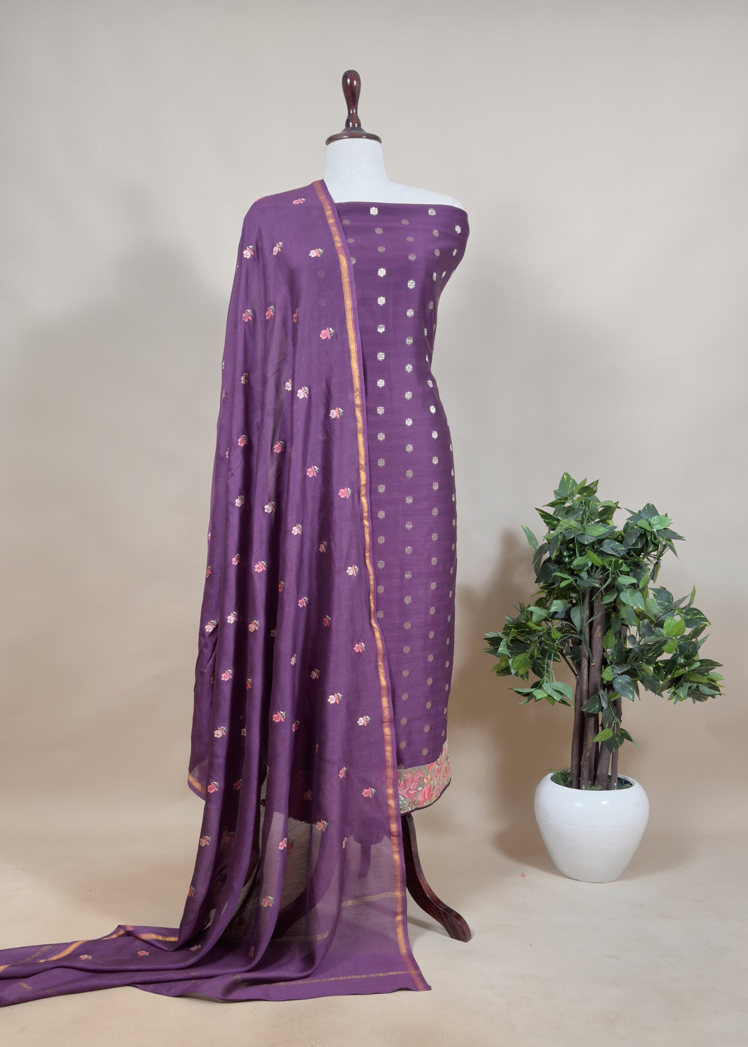 Classic Blue Handloom 70gm Chanderi Unstitched Suit Set With Multicolour Embroidery