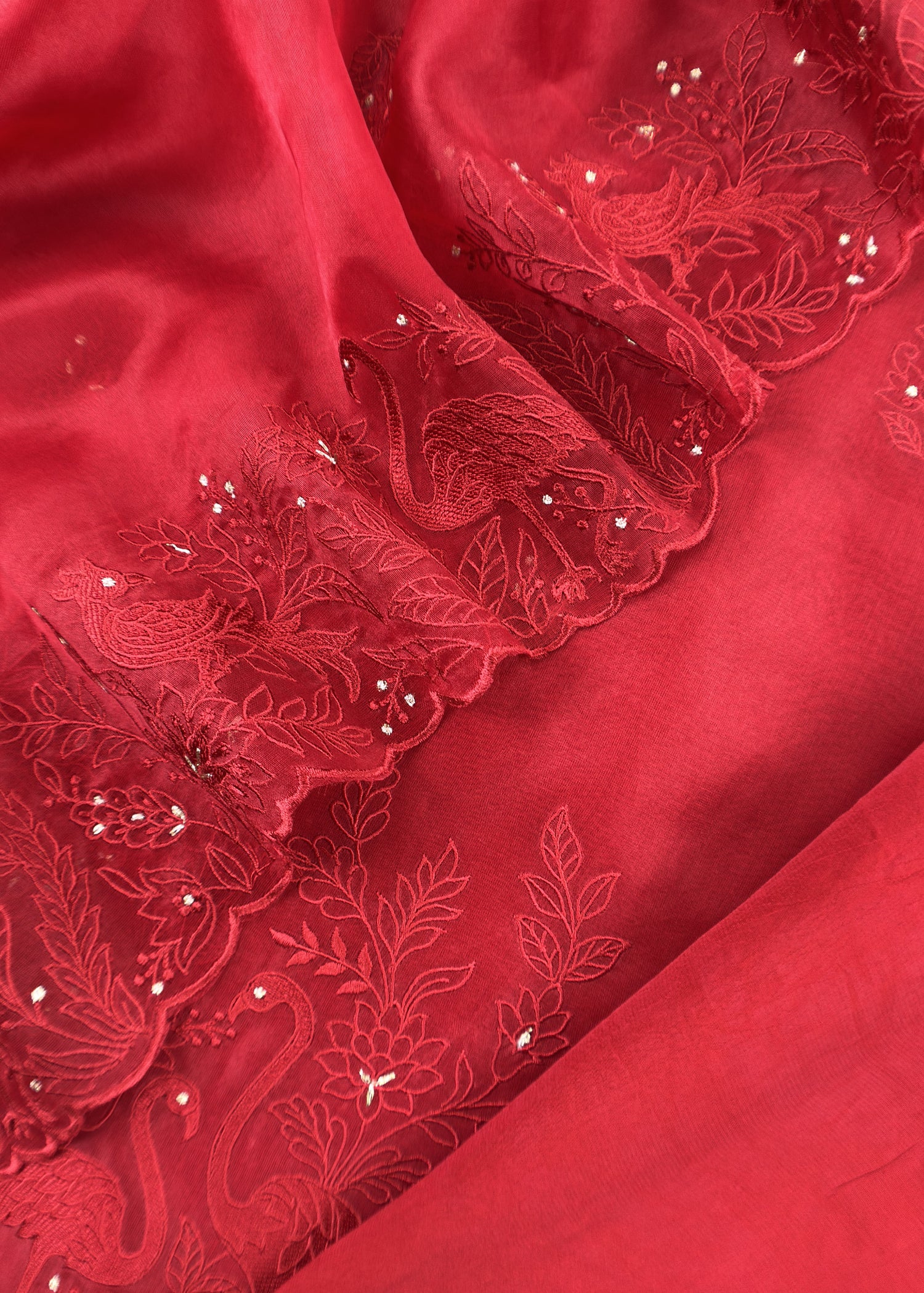 Classic Red Organza Silk Suit Fabric with Parsi Flamingo Embroidery