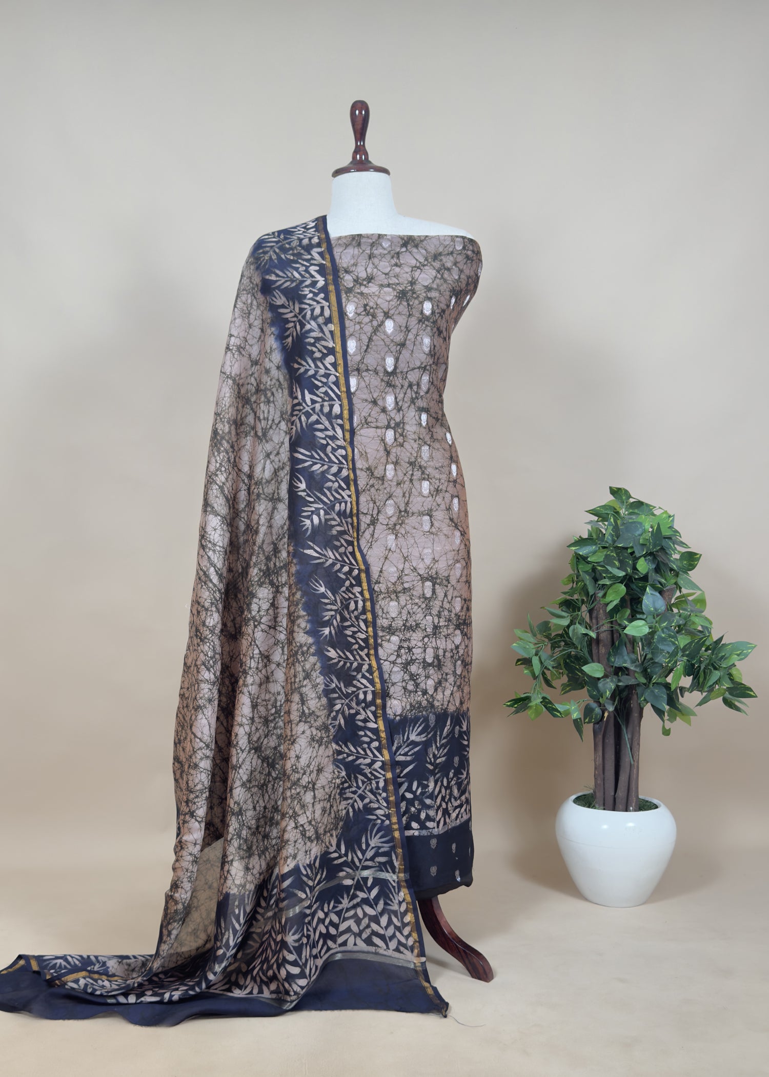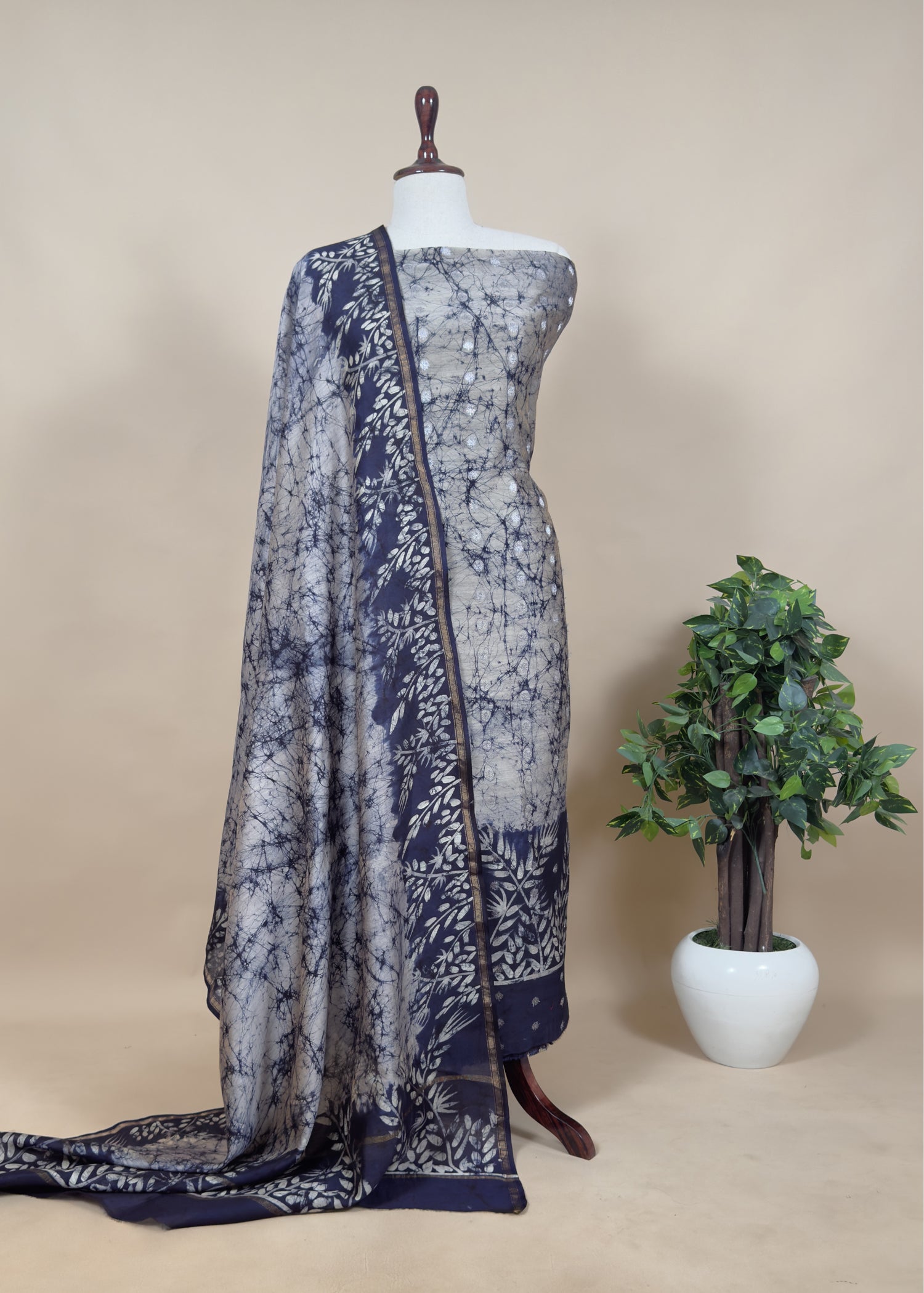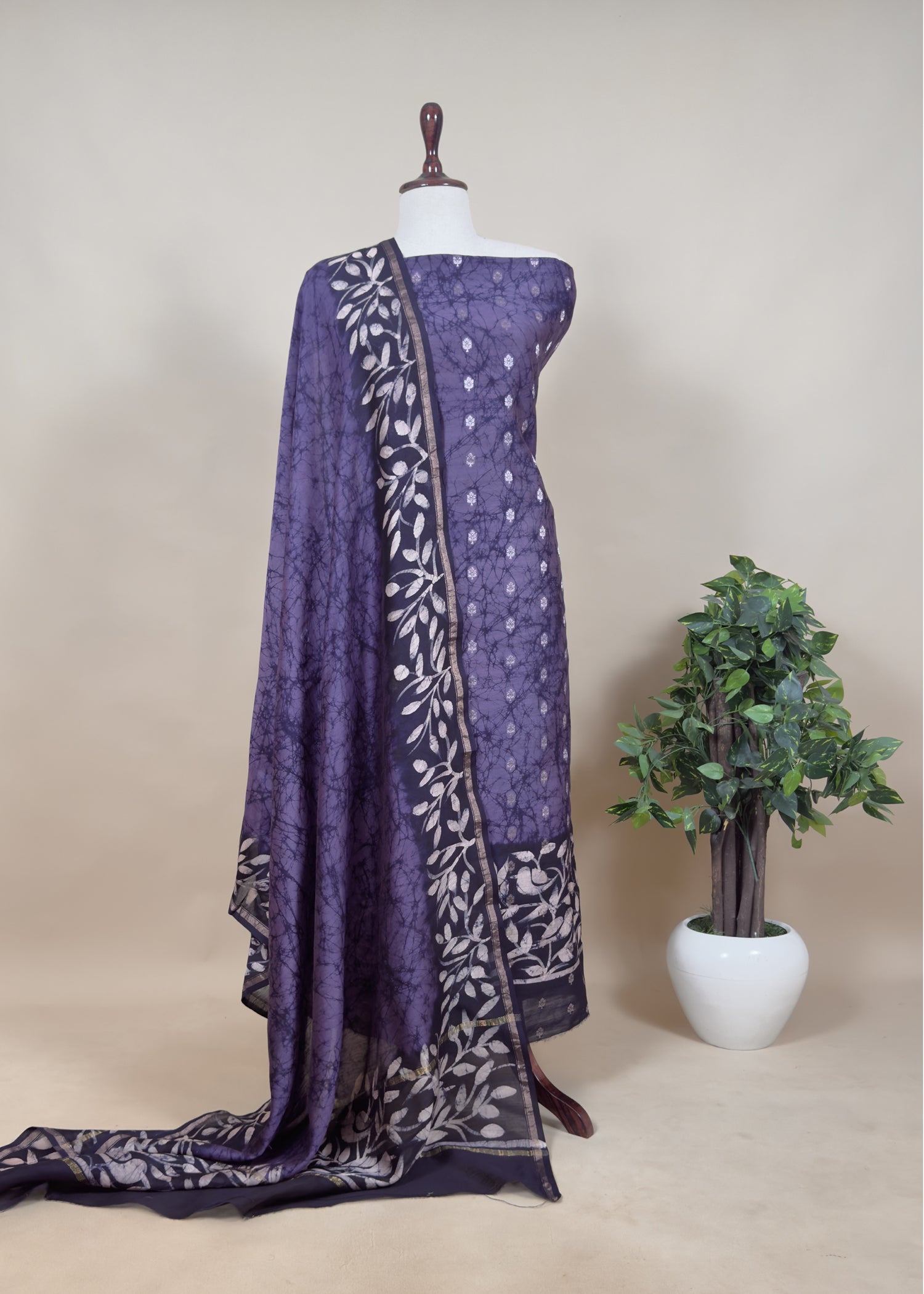 Presenting our luxurious unstitched three-piece suit set, crafted from pure Banarasi Maheshwari Silk, adorned with traditional tie-and-dye prints and delicate golden Banarasi bootis. The set is completed with a pure cotton satin bottom.
