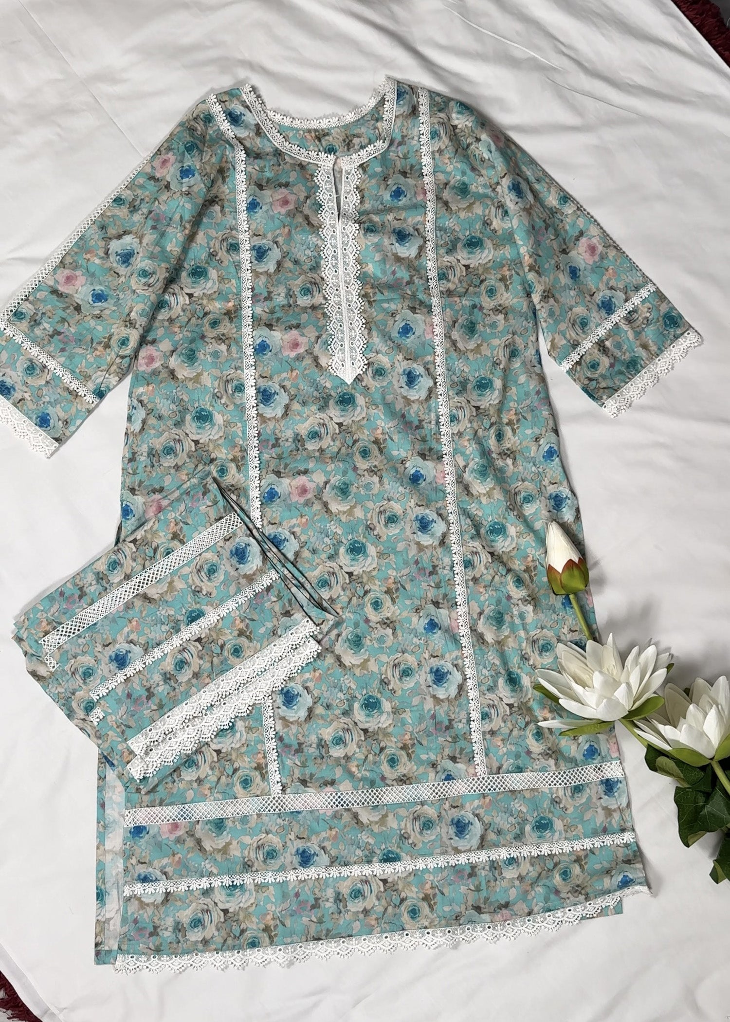 Comfort wear Cord Set in Lawn fabric adorned with beautiful laces