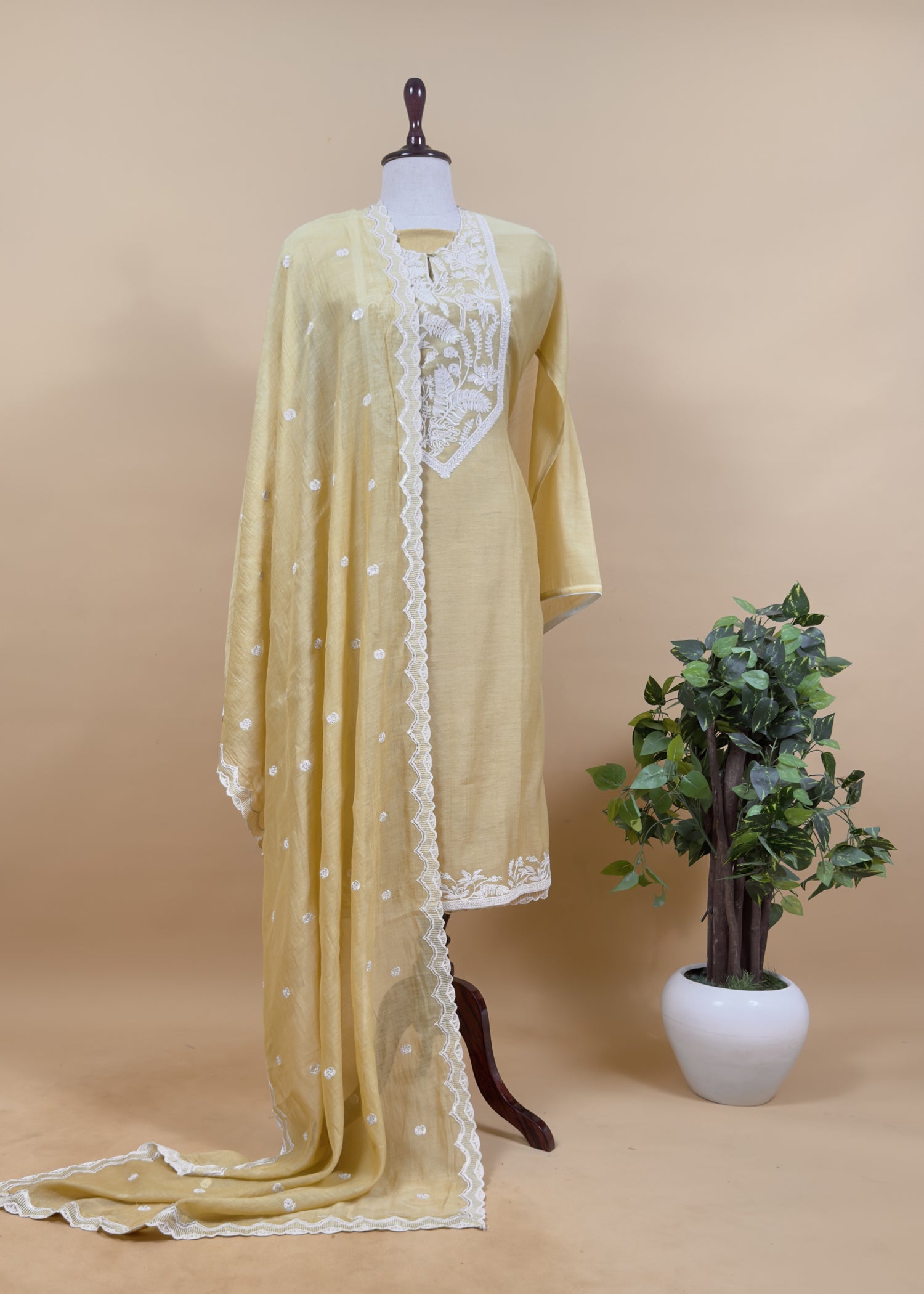 Pure Mul Chanderi kurta and dupatta having beautiful Palm trees and flamingos French Thread embroidery on the front yoke, ghera and scalloped dupatta with bootis. The three piece suit comes with cotton satin bottom.