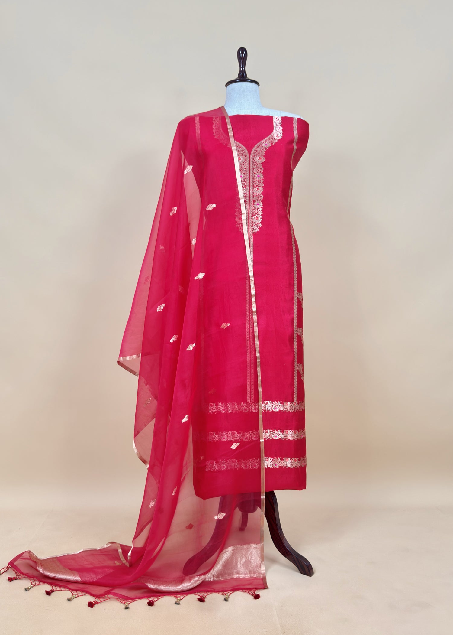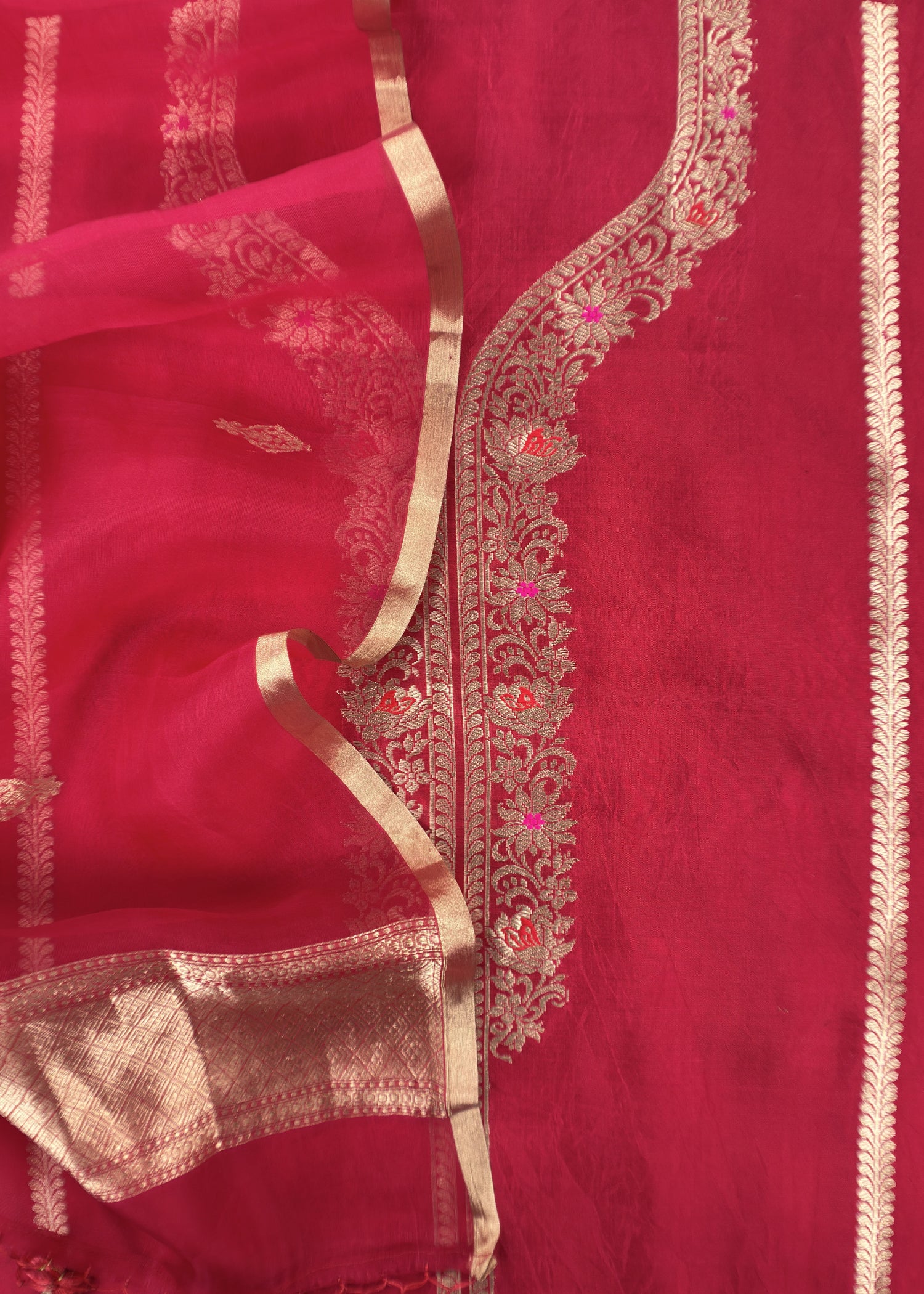 Exquisite handloom silk kurta comes with beautiful traditionally kadwa weaving front panels with Meenakari detailings, paired with Handloom kora silk dupatta with all over kadwa weaving bootis, pallu borders and handmade tassels. The suit comes with matching handloom silk lowers.