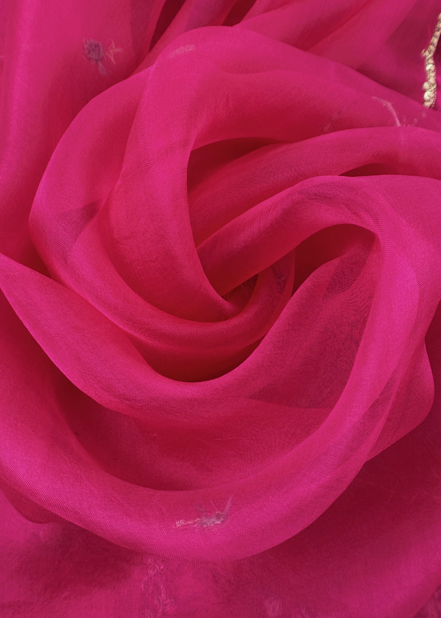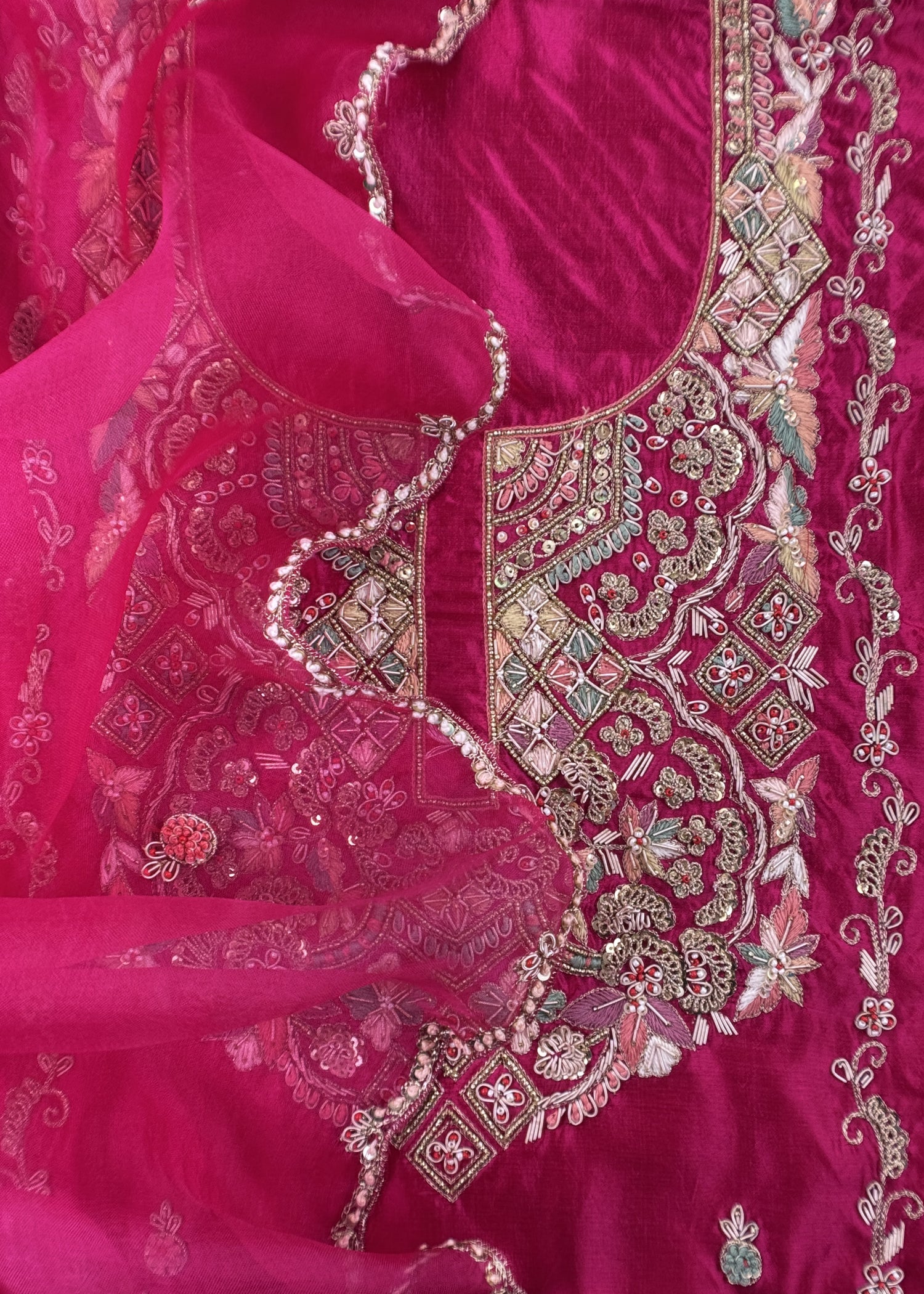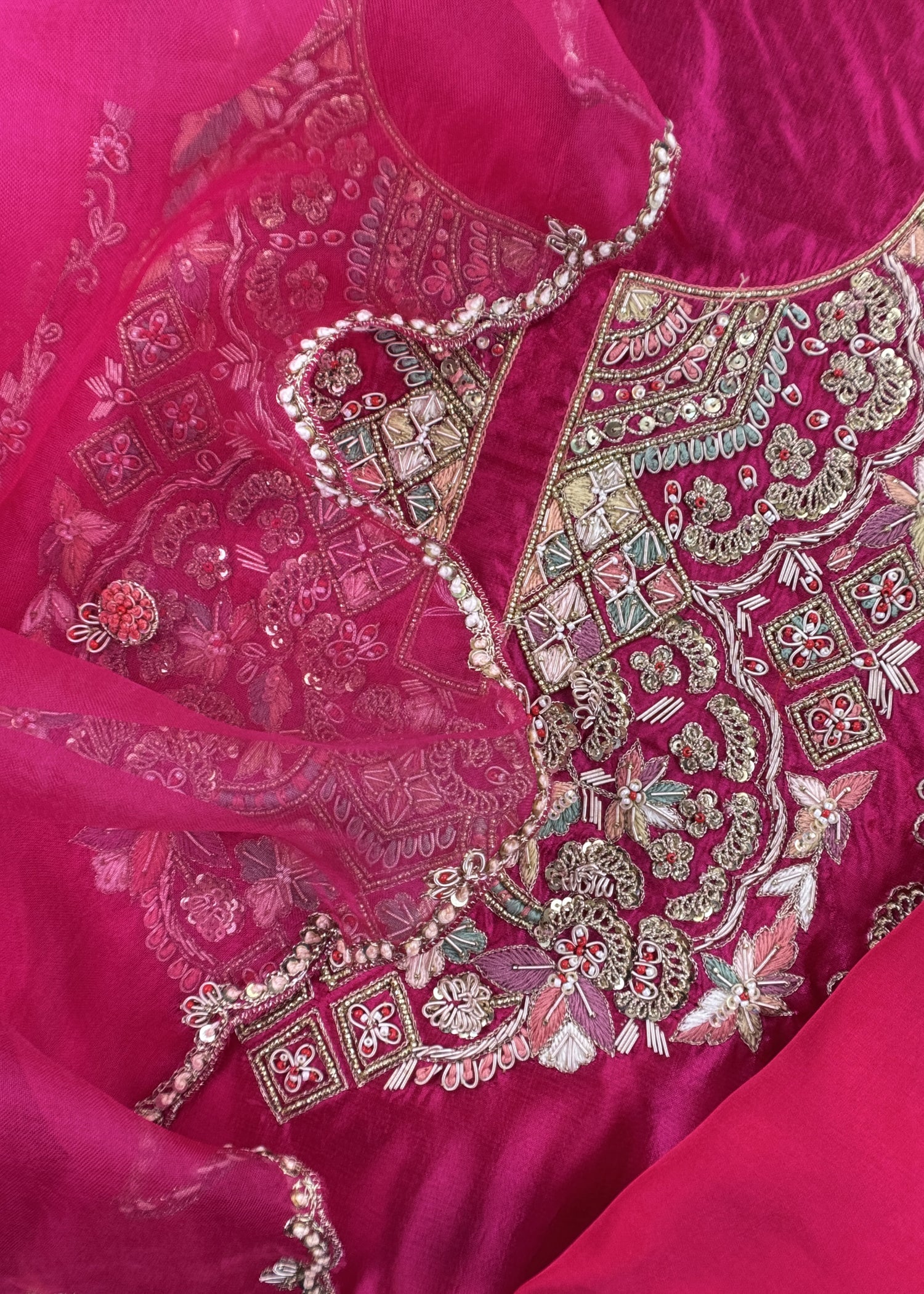 Deep Pink Handloom Silk Suit With Zardosi Embroidery