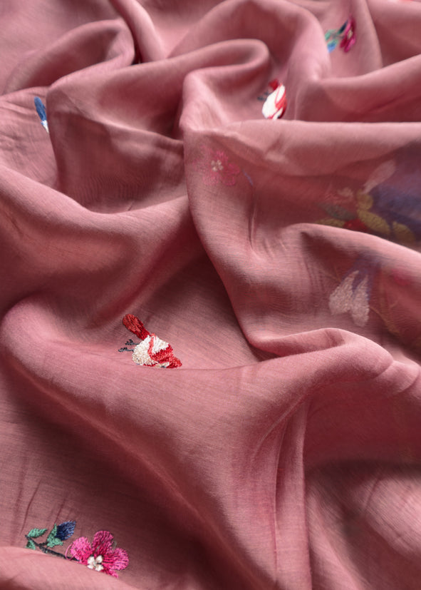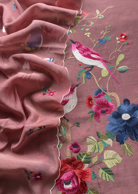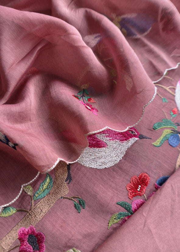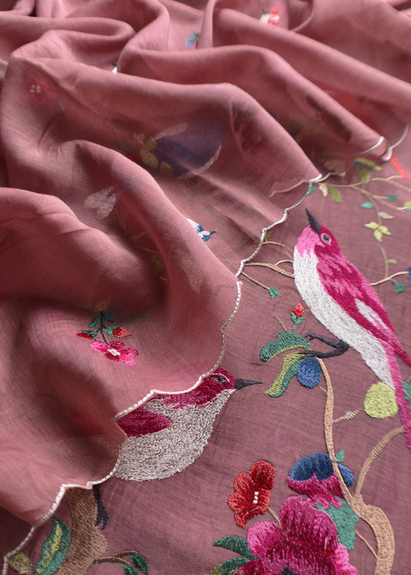 Drak Mauve Pure Mul Cotton Chidiya Embroidered Suit With Dupatta