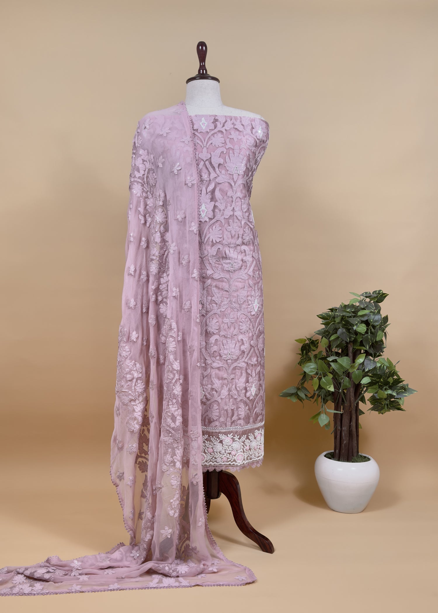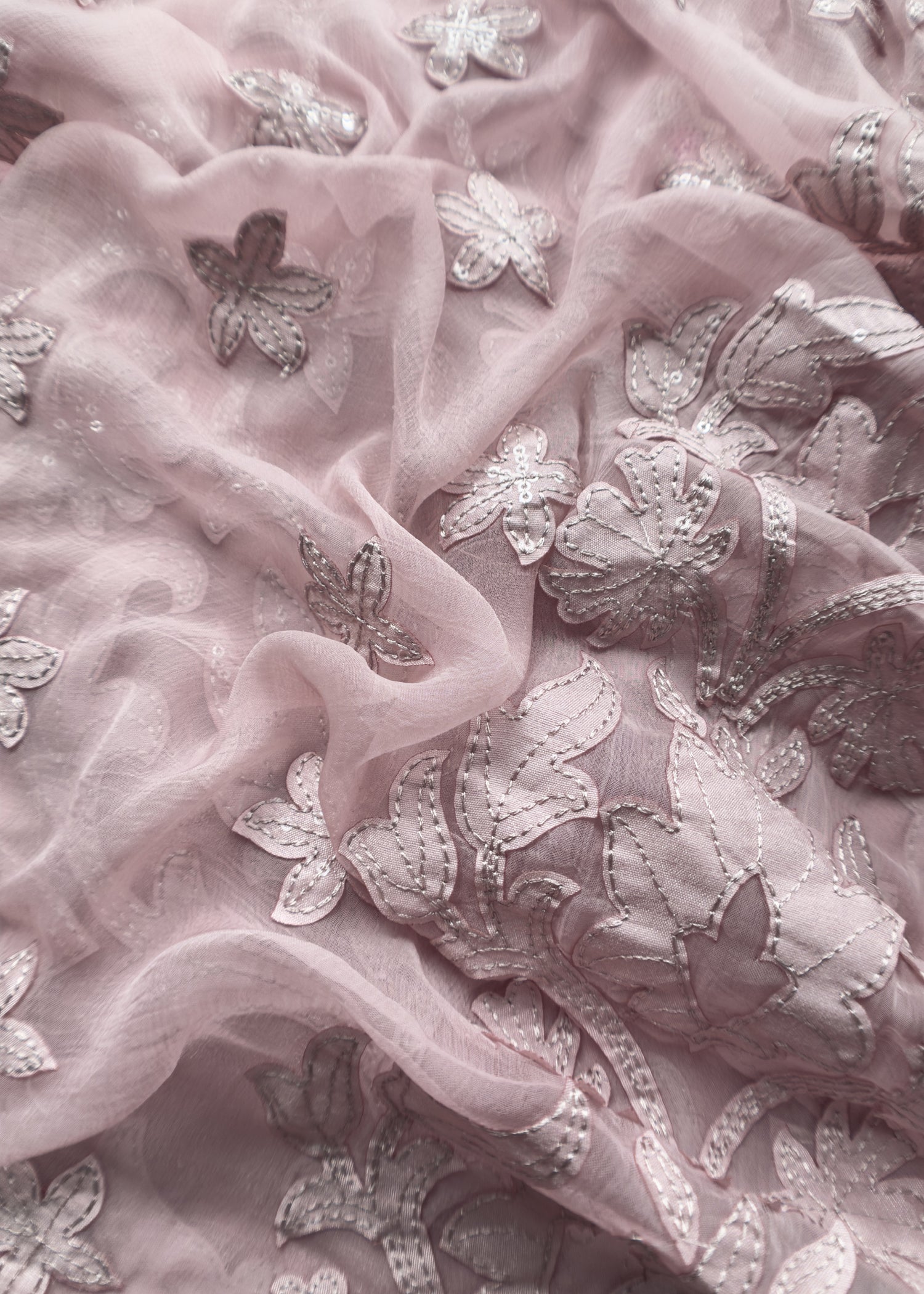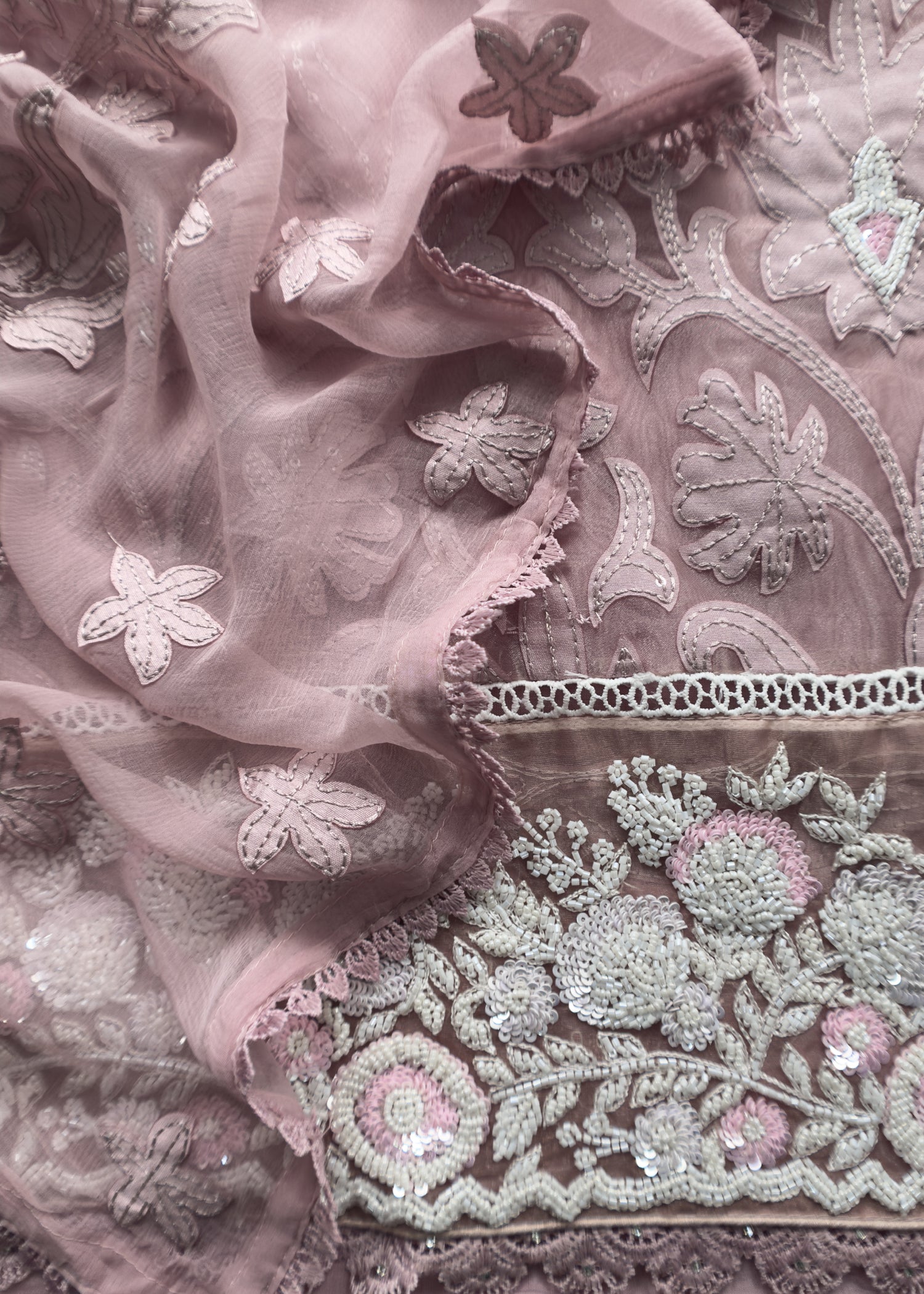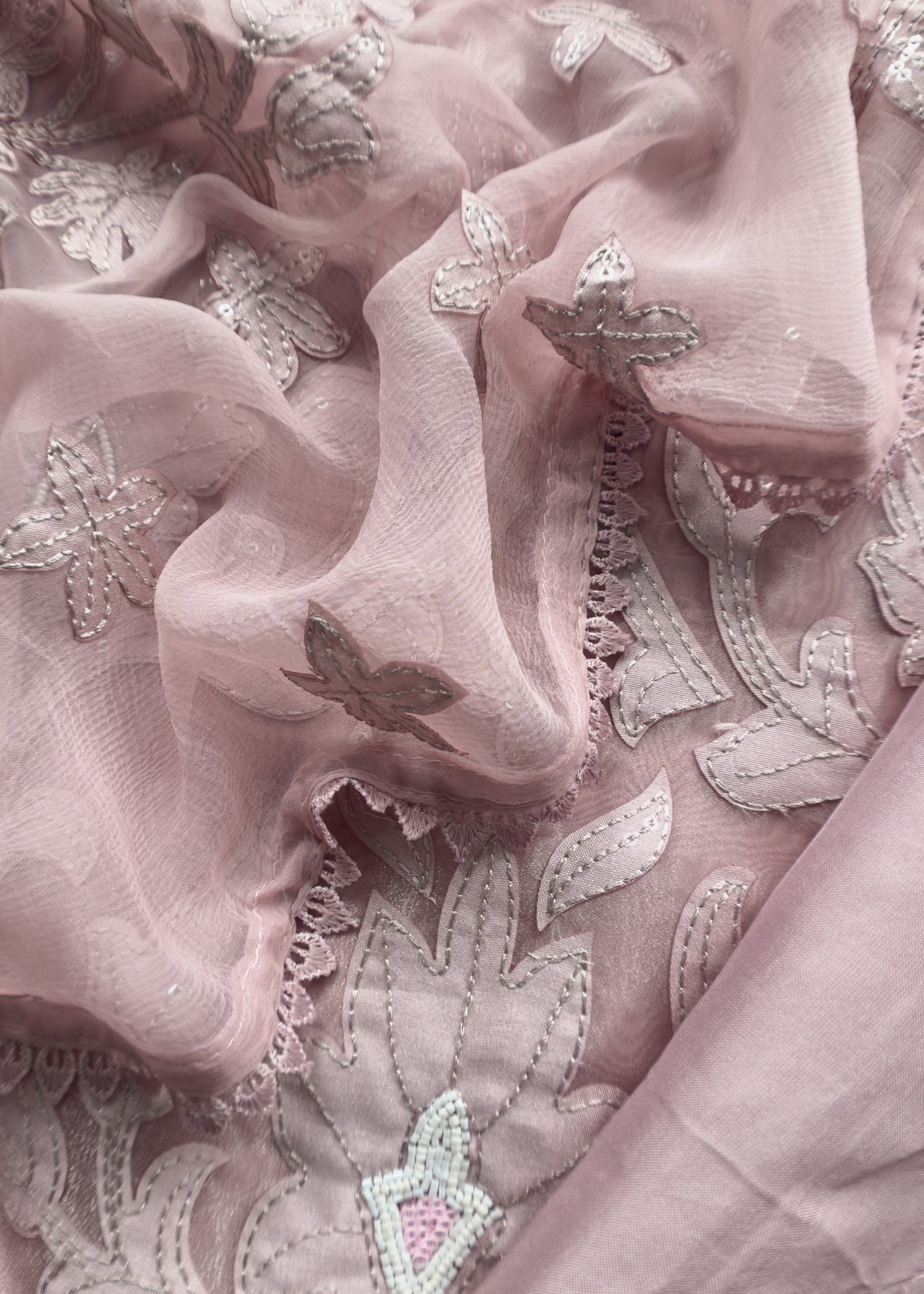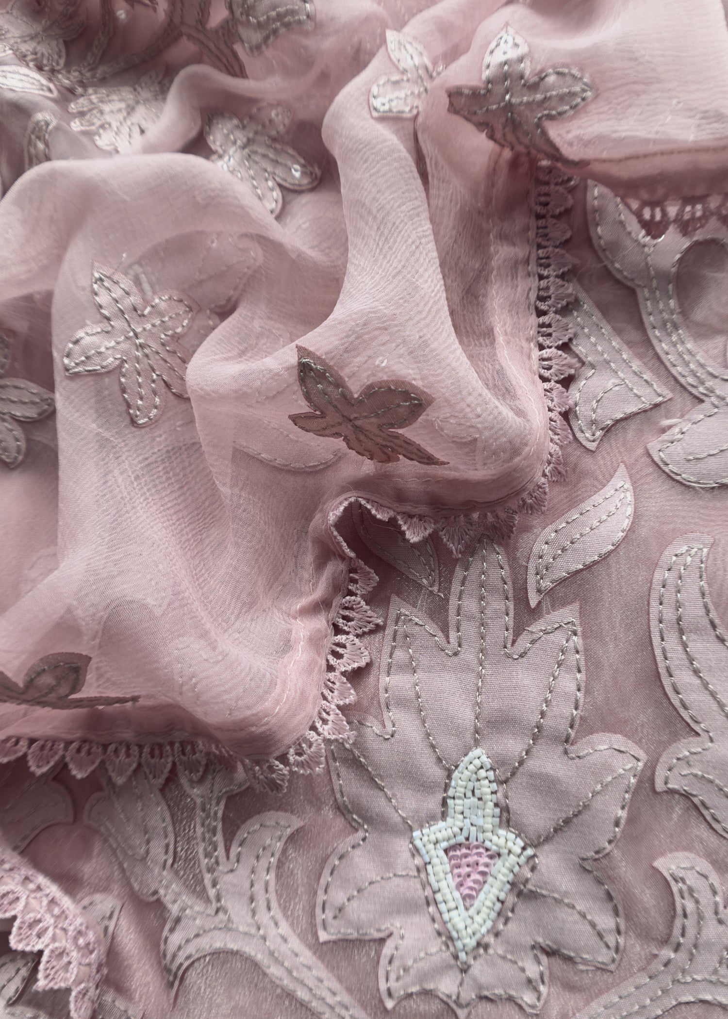 Dusty Pink Tissue Kurta With Pure Chiffon Dupatta With Appliqué Work And Hand Work