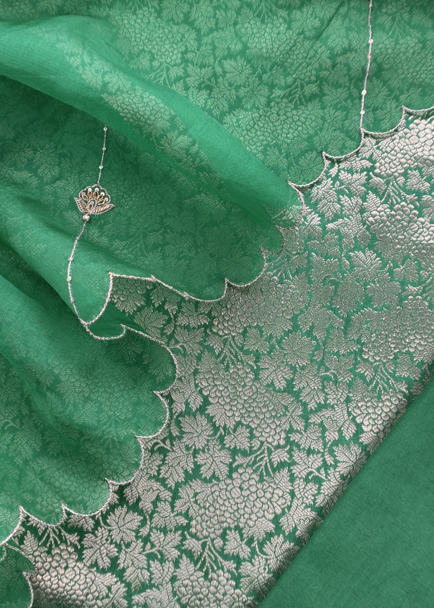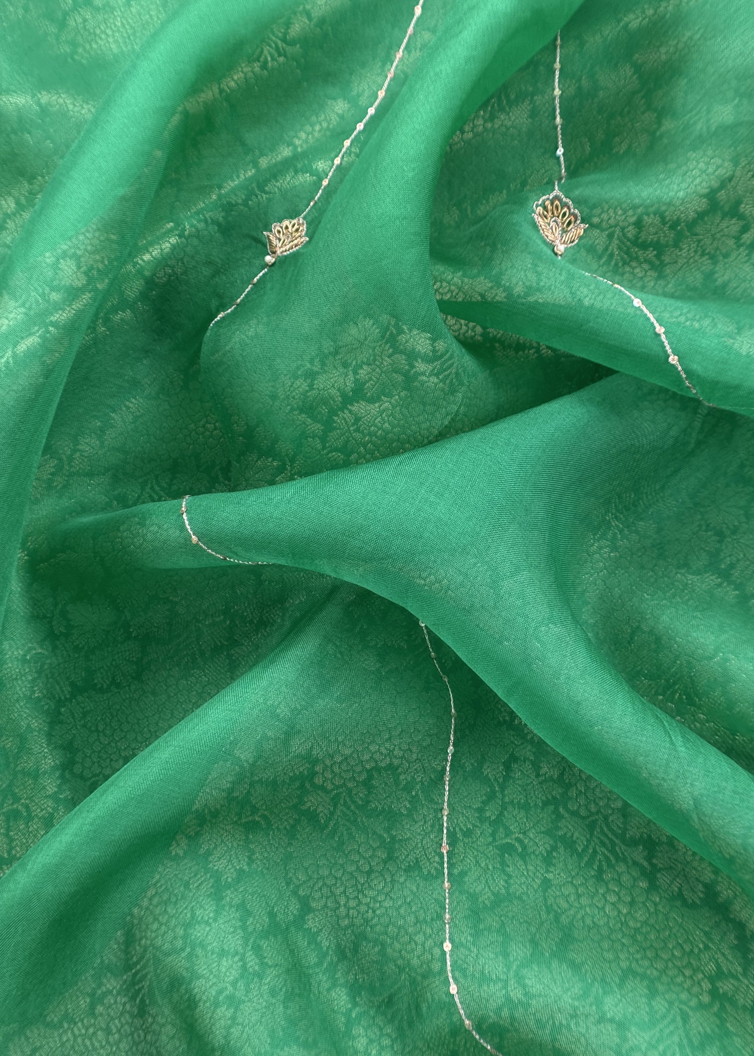 Emerald Green Brocade Silk Kurta And Organza Silk Dupatta with Handwork
