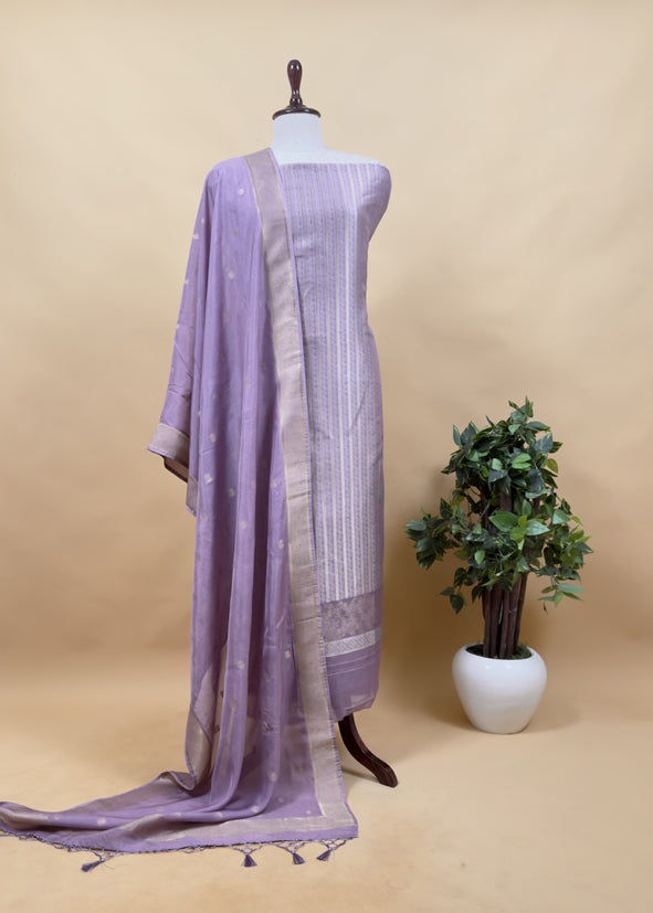 Shop gorgeous pure brocade silk kurta and floral weaving on Daman paired with dupatta with four-side borders and zari bootis. The three piece suit comes with matching silk lowers.