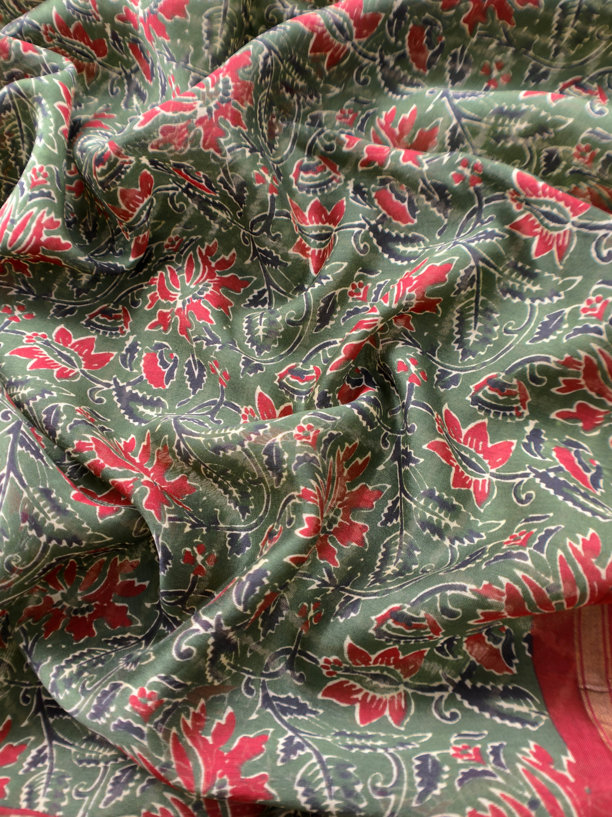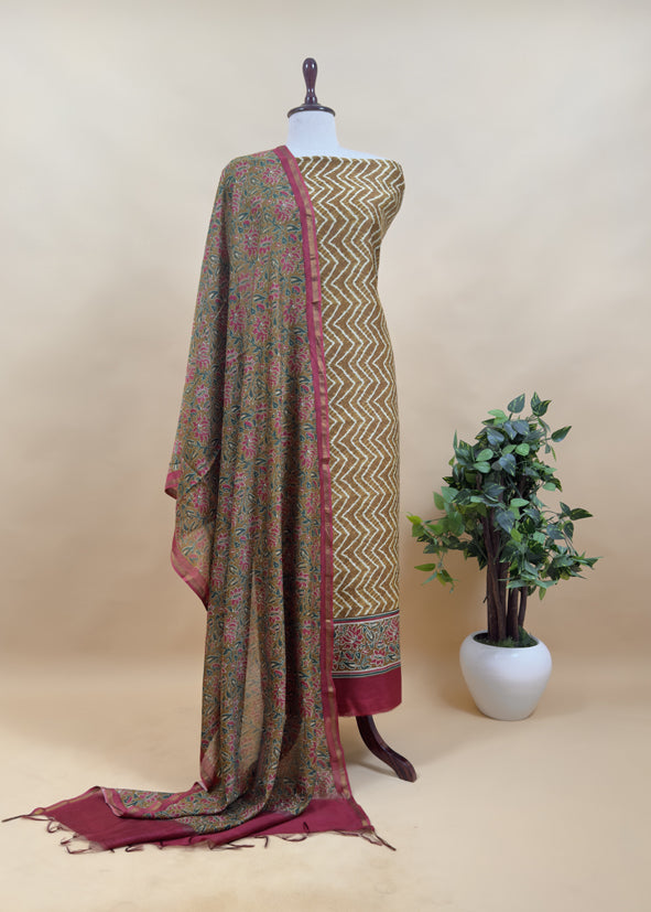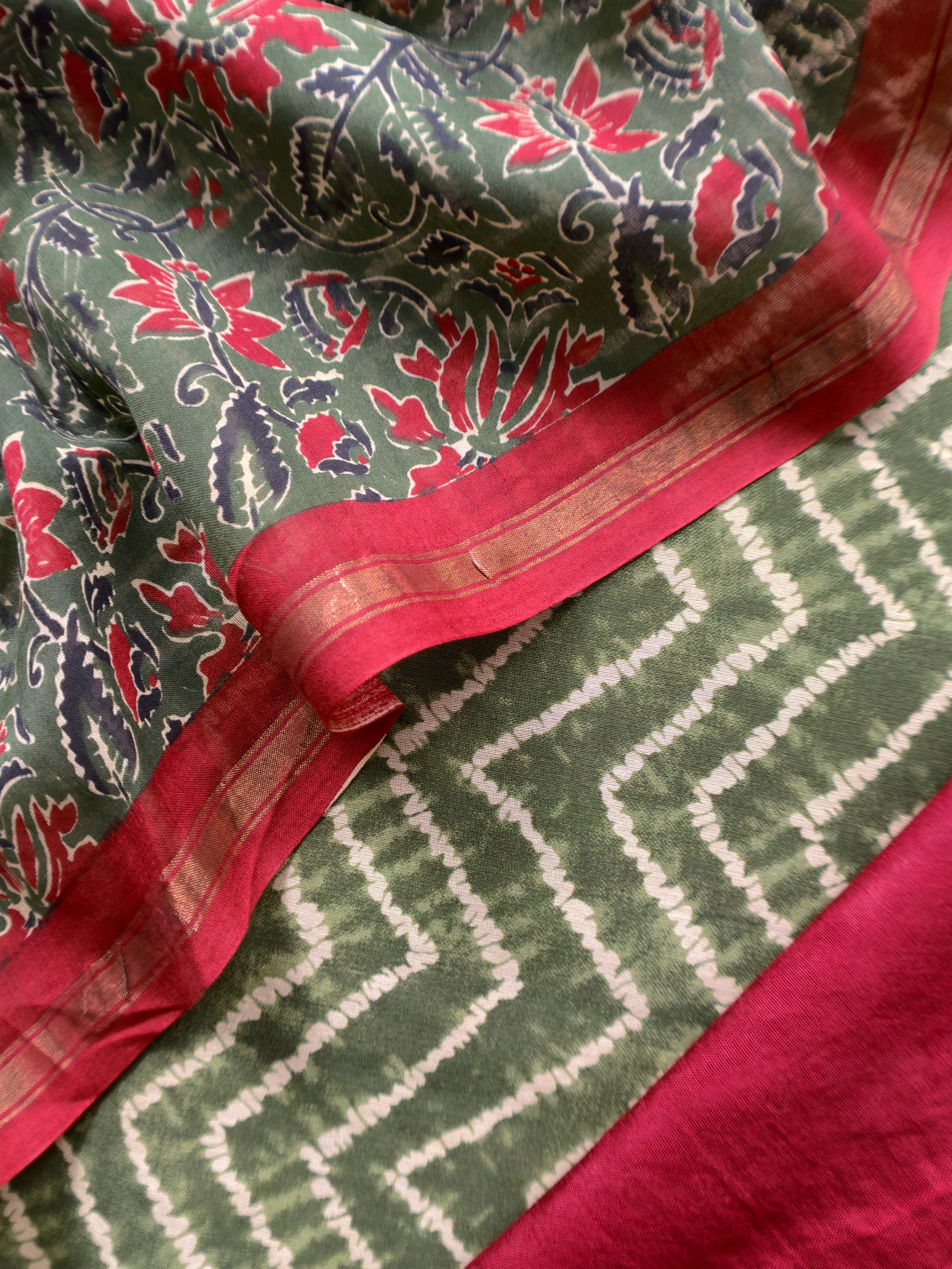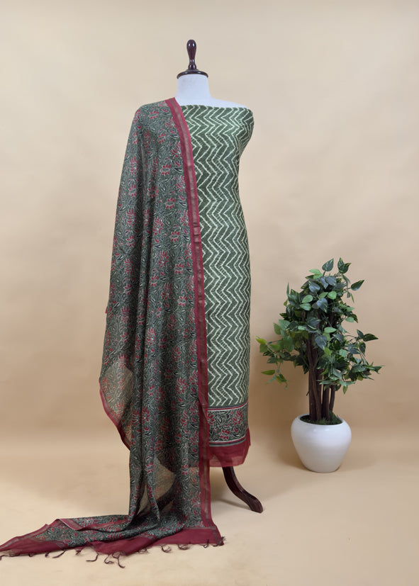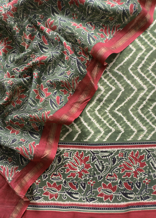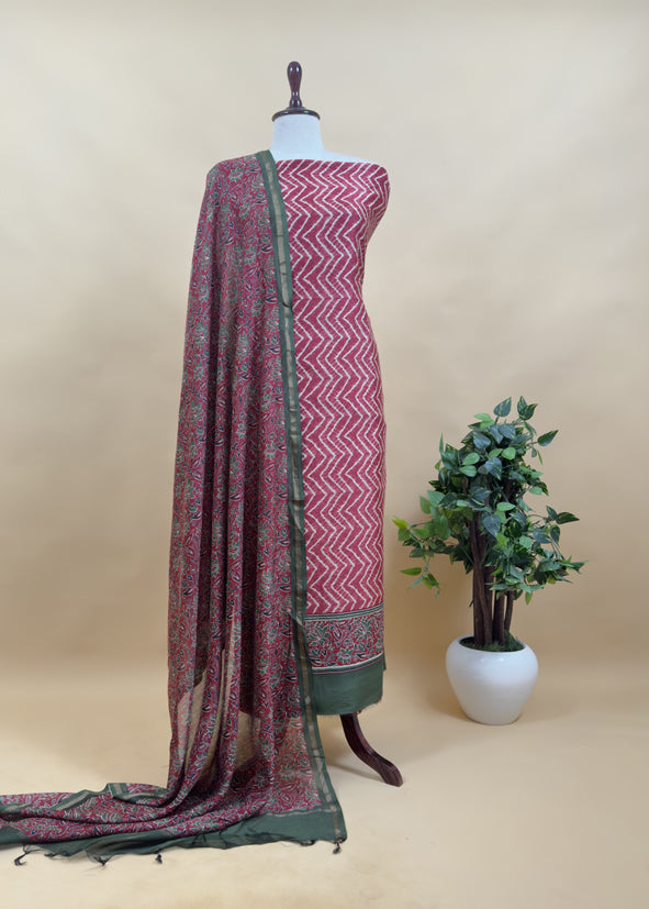 Fern Green And Red Ajrakh And Leheriya Handloom Maheshwari Silk Suit Fabric