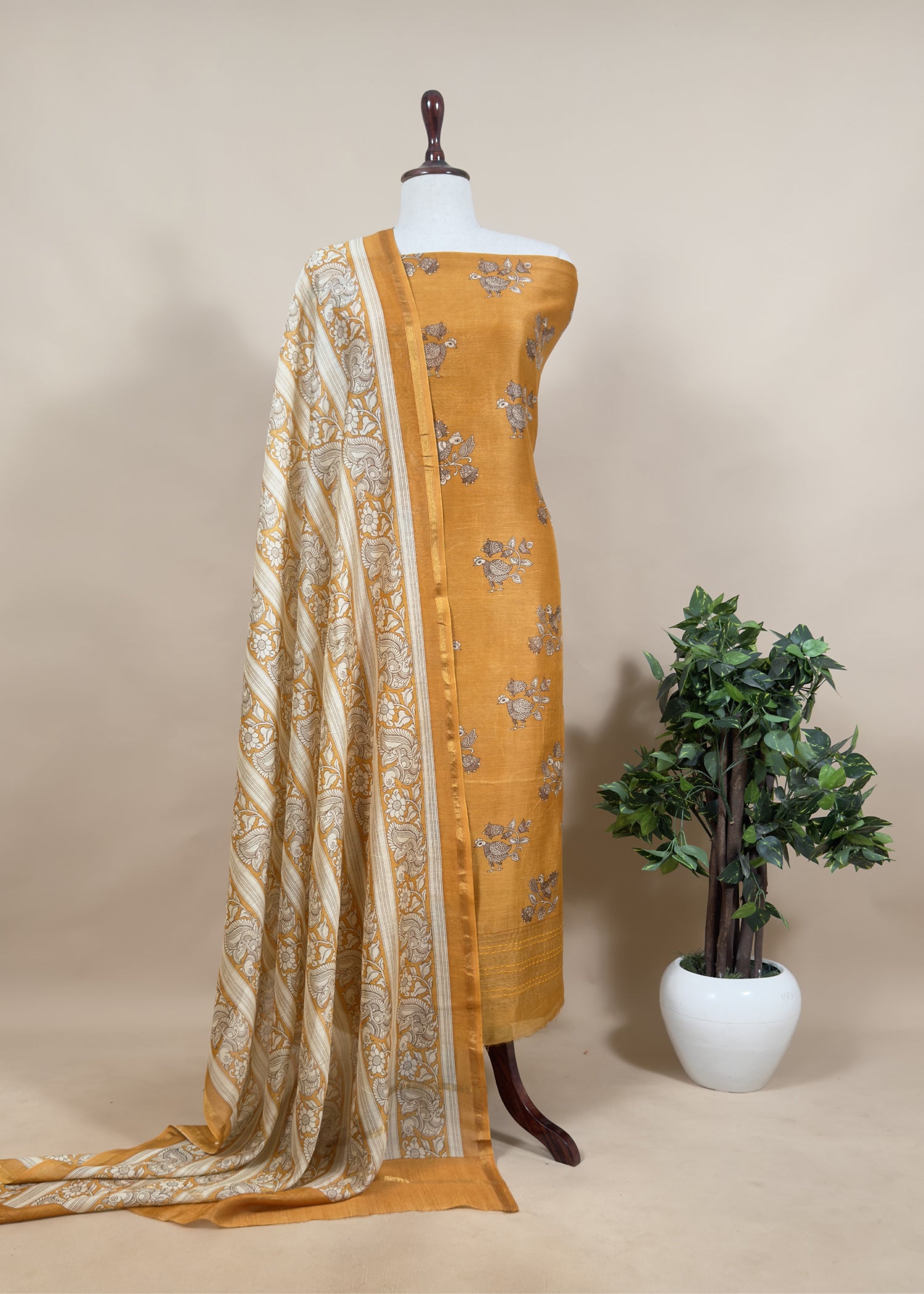 Three piece unstitched suit fabric crafted in pure Maheshwari silk with all over Maheshwari fabric adorned with Madhubani print and Kantha Handwork on the ghera of dupatta. The suit comes with plain matching lowers.