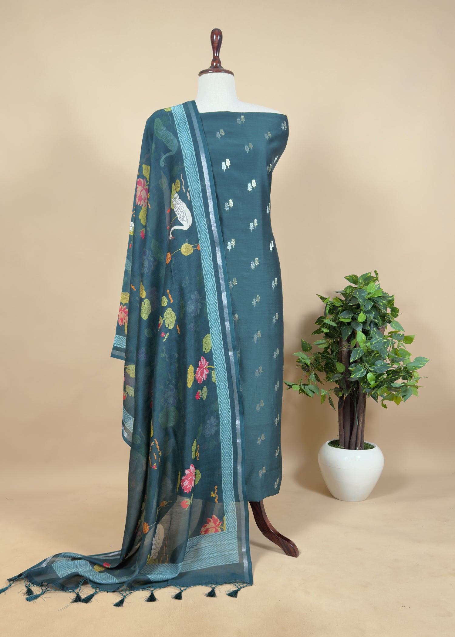 Kalasheel premium Banarasi Chanderi unstitched suit set is adorned with all over subtle gold zari bootis on the kurta paired with mesmerizing dupatta depicting lively pond life flamingo, leaves, ducks and lotus flowers.