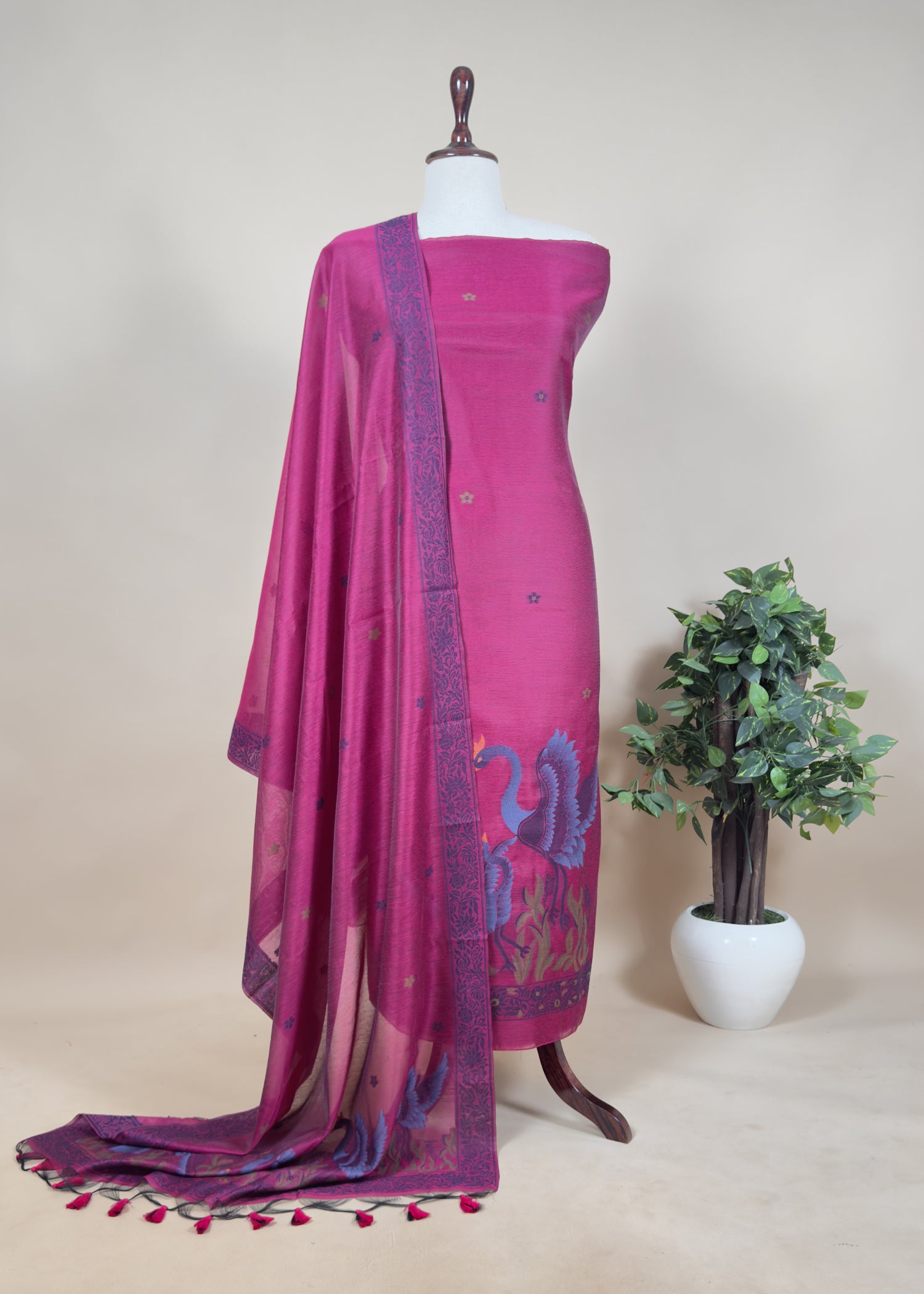 Bringing the legacy of 16th century Jamdani kaarigars in our bestseller three-piece unstitched suit set from Kalasheel's Flamingo Edit in fine chanderi fabric.
