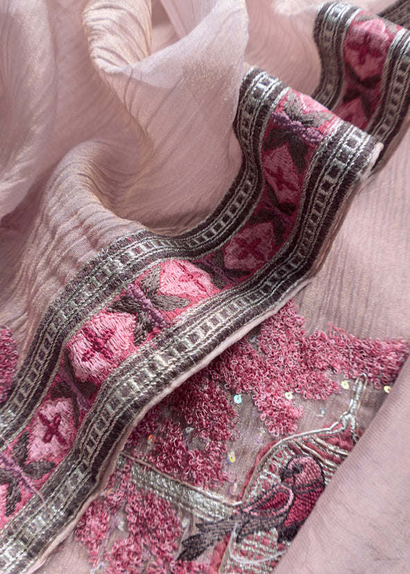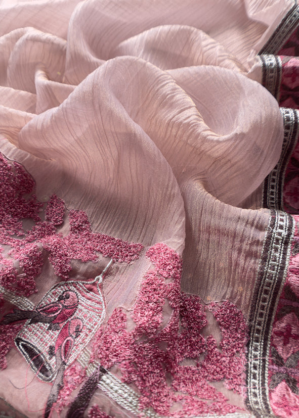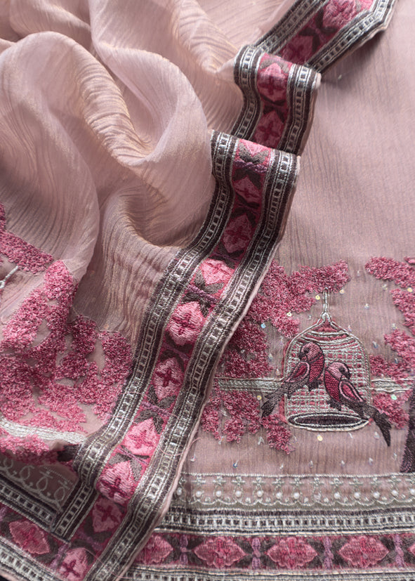 Flamingo Pink Crushed Tissue Silk Suit With Chidiya Embroidery