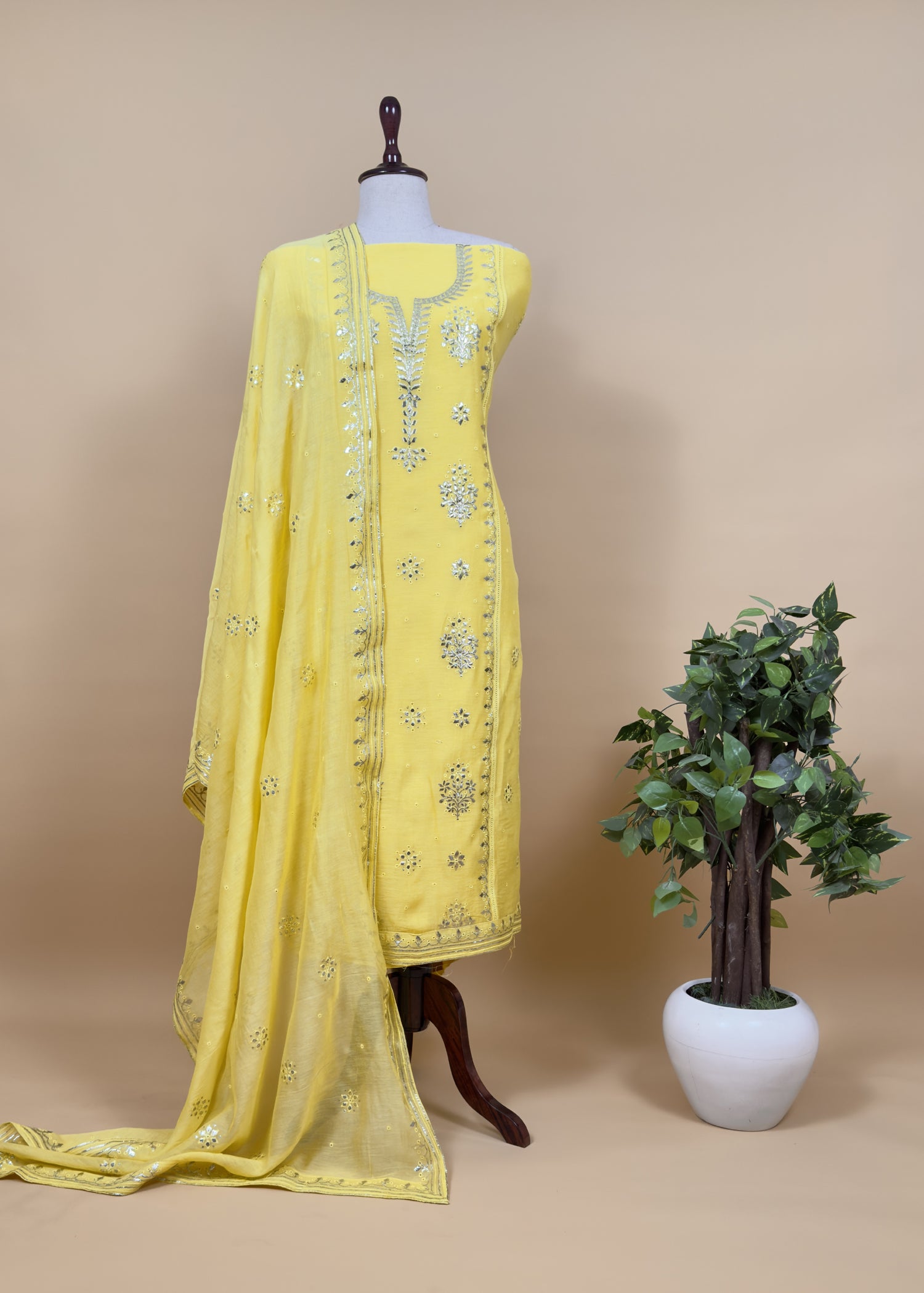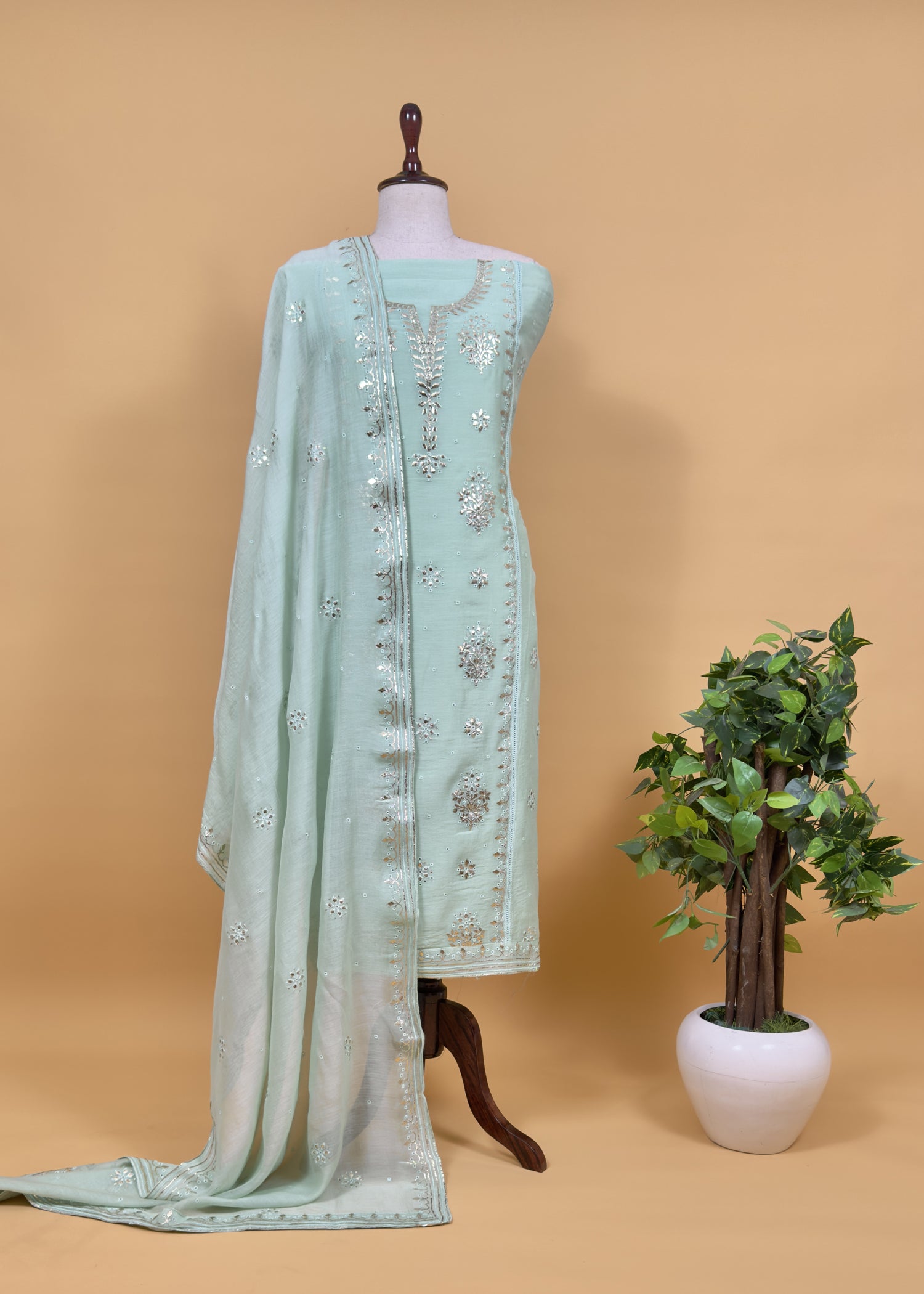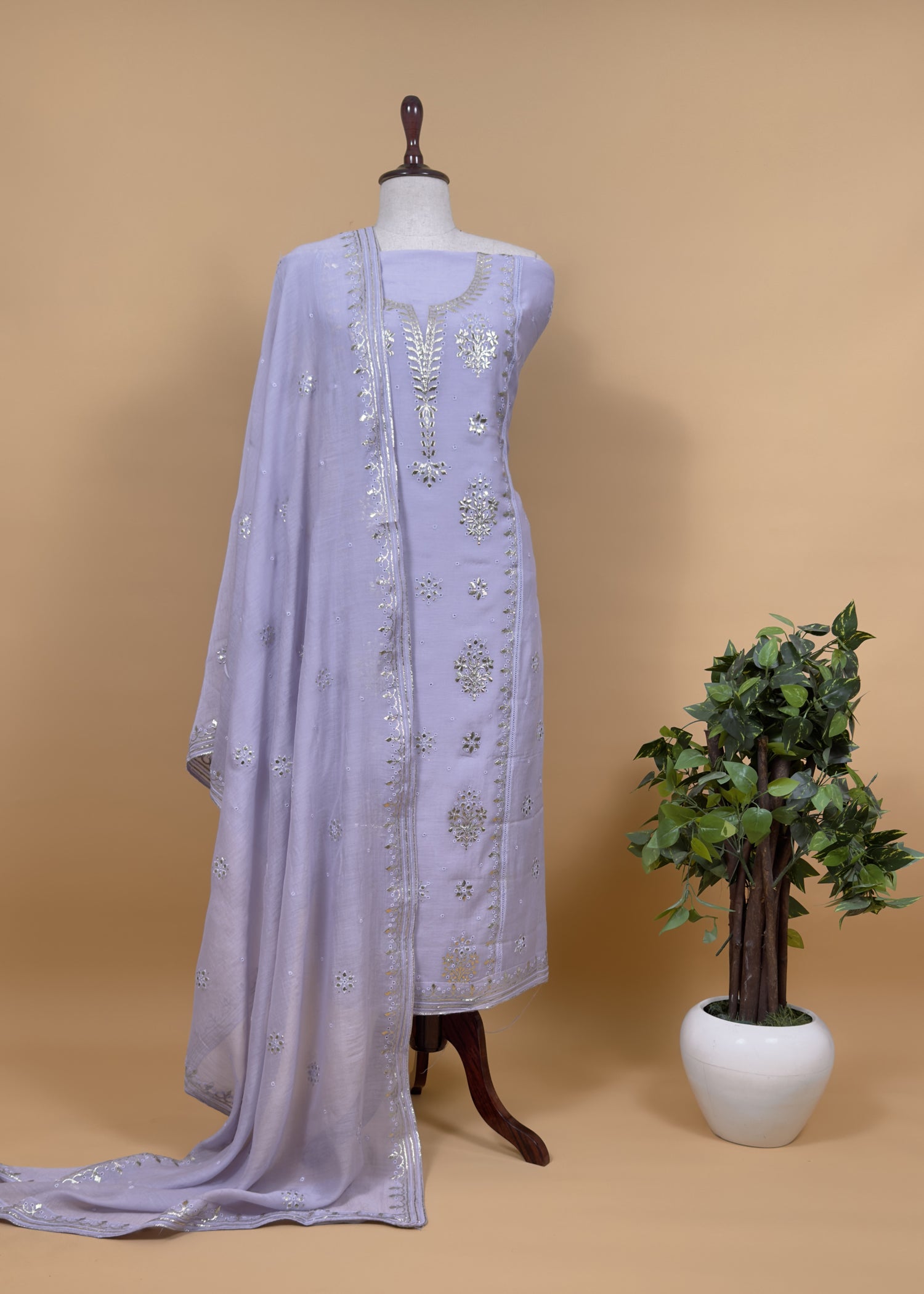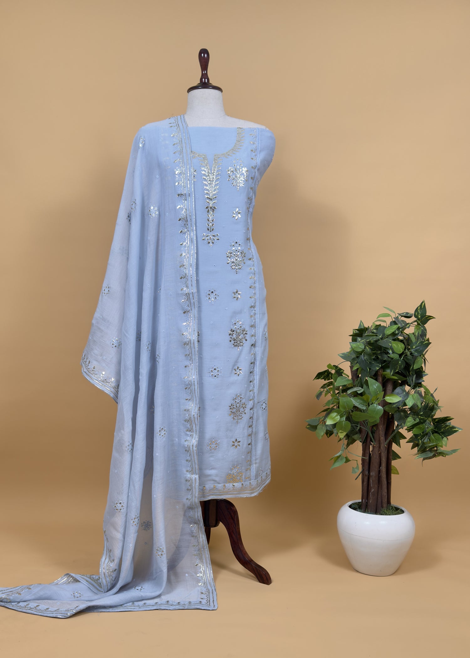 Stunning kurta and dupatta in pure mul chanderi fabric showcasing lakhnavi craftsmanship of pitta hand work in vertical panels and Kutch embroidery detailings all over it. The three-piece suit comes with matching cotton satin lowers and extra hand work patches for sleeves.