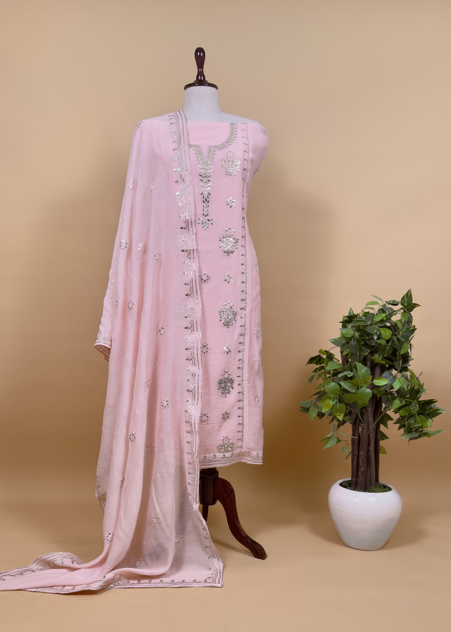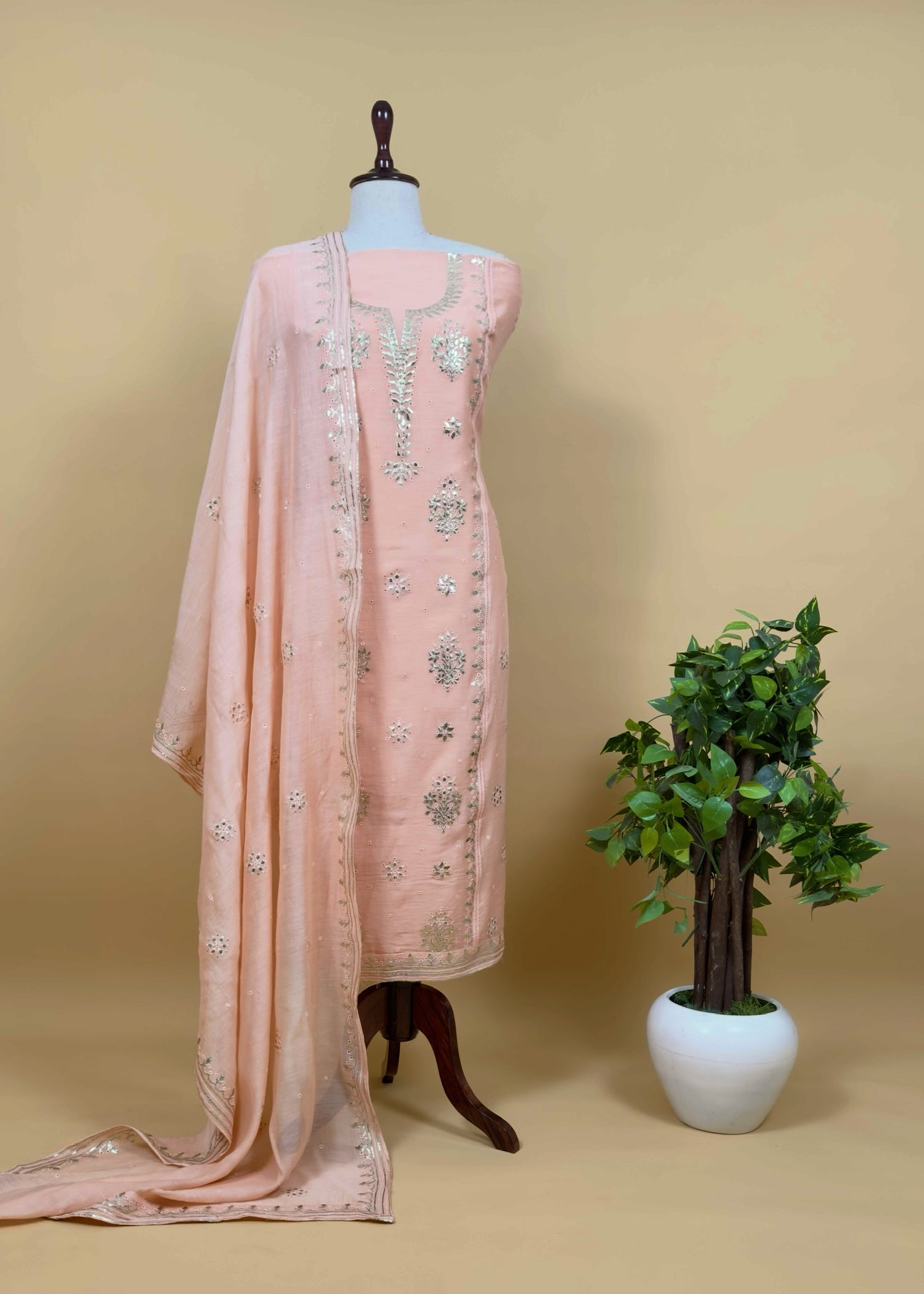 Flamingo Pink Handloom Mul Chanderi Suit With Gold Pitta Hand Work And Embroidery