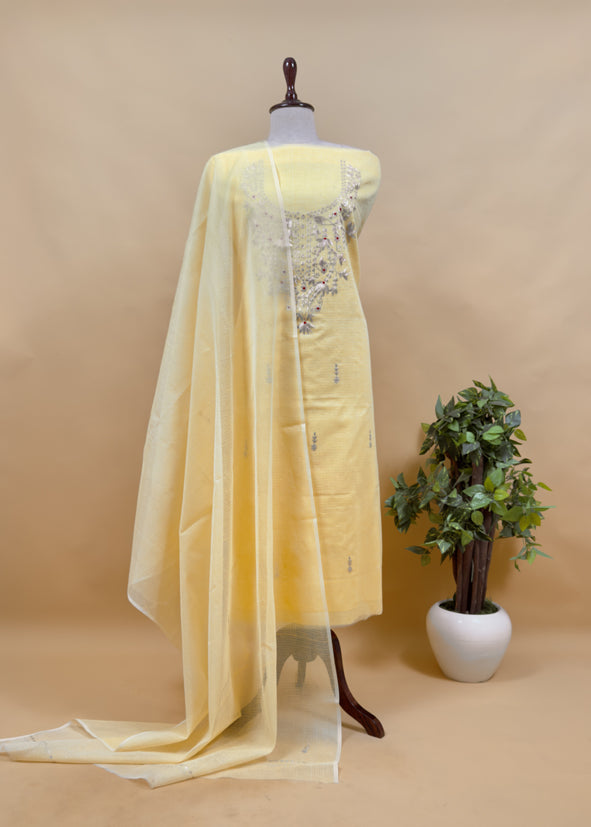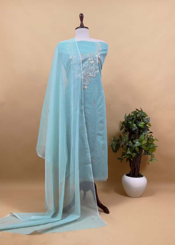 Get your hands on this elegant kurta and dupatta set in pure Kota Doria fabric, beautifully adorned with pitta work and Resham embroidery on the kurta and all over the dupatta. This graceful three-piece suit comes with a matching bottom.