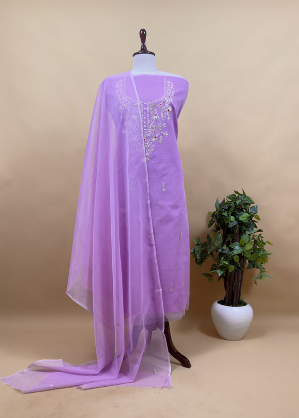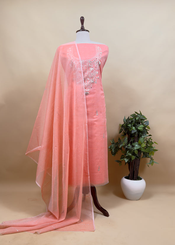 Flamingo Pink Kota Doria Dupatta Suit With Pitta Work