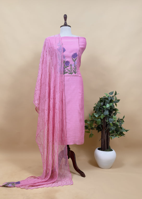 Flamingo Pink Pure Mulmul Suit with Appliqué Work and Embroidery
