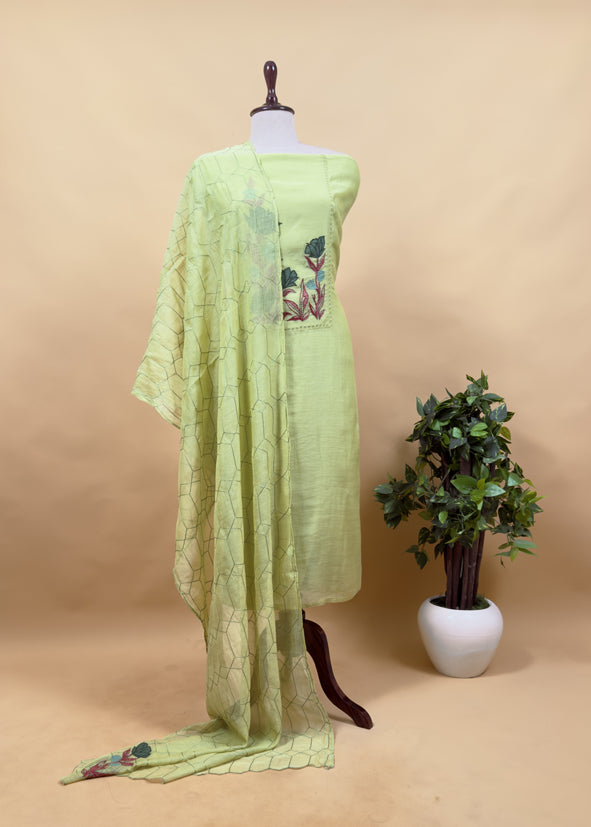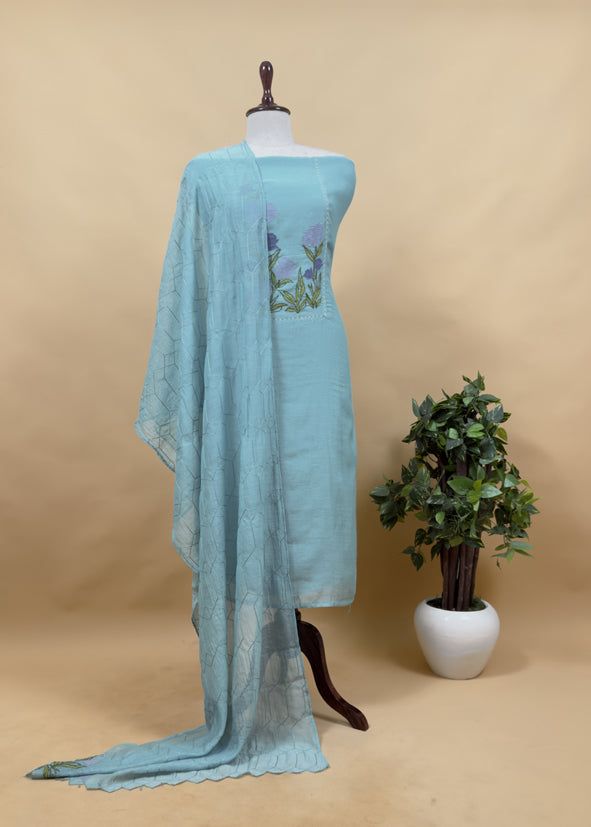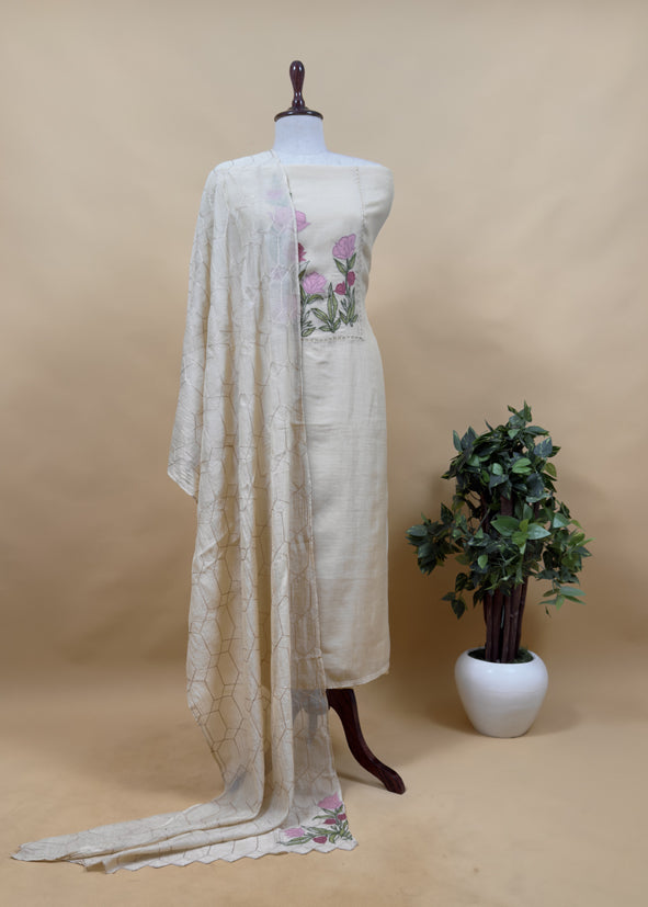 Shop our comfiest mulmul suit with butter like feel on skin adorned with floral appliqué work on neckline and hexagon embroidered mulmul stall dupatta. The three piece suit comes with matching cotton satin lowers.