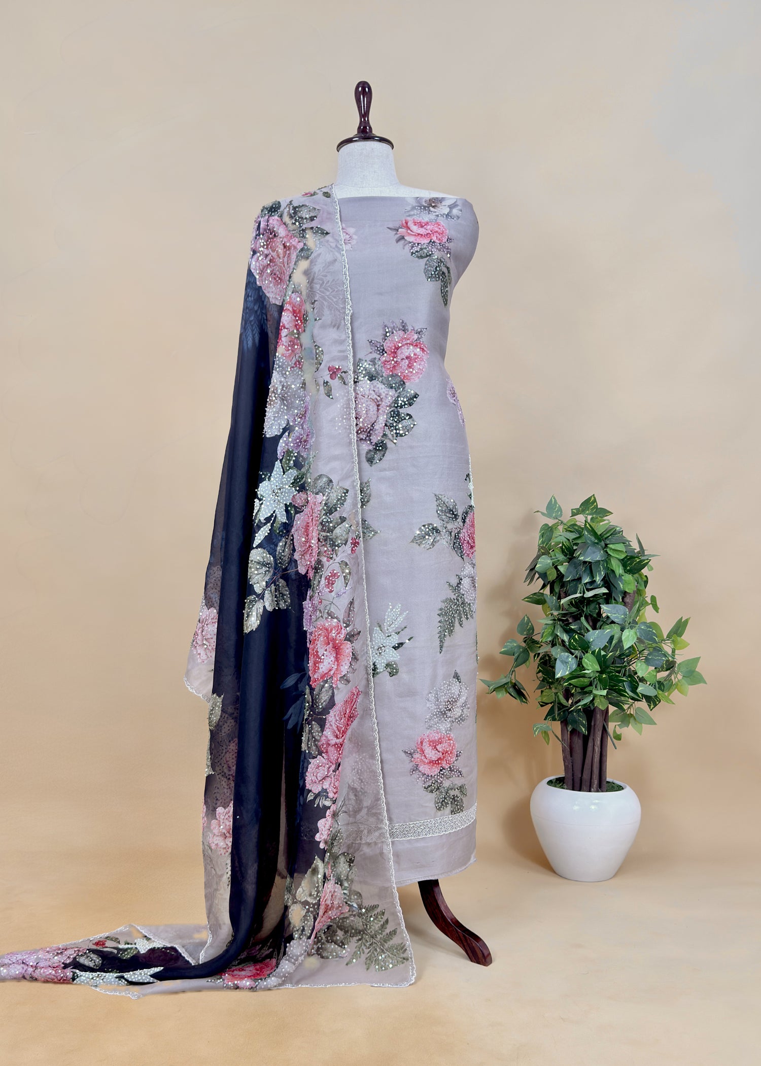 Floral Paradise Cheeku Charcoal Floral Sequin Suit In Pure Kora Silk Fabric