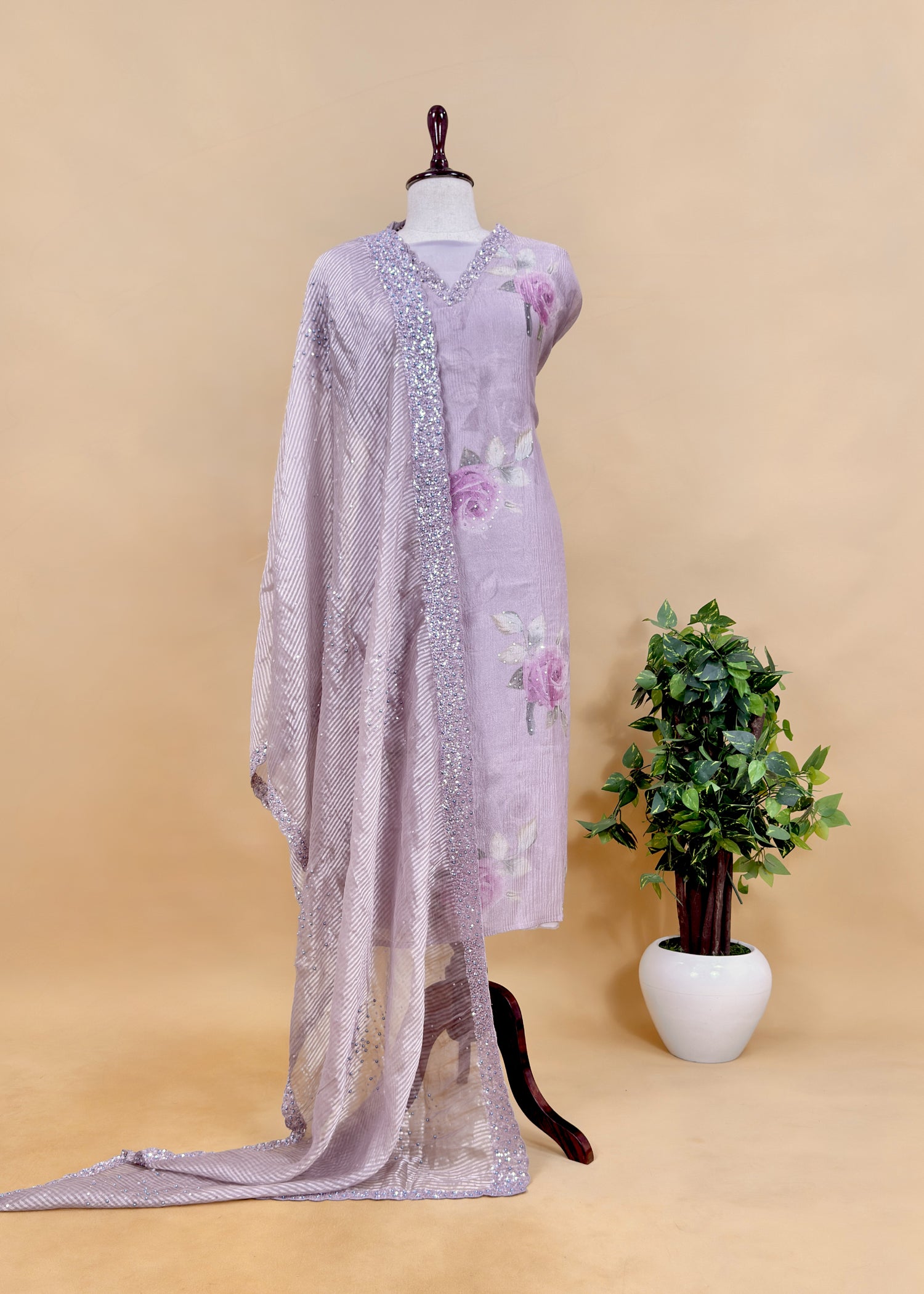 This luxurious crushed Tissue-Silk ensemble features handbrush pastel roses with gorgeous colorful pearls and sequin detailing on the neckline, beautiful crushed tissue with zari lurex stripes and fourside borders with delicate pearl and sequins handwork. The three-piece suit comes with matching bottom.