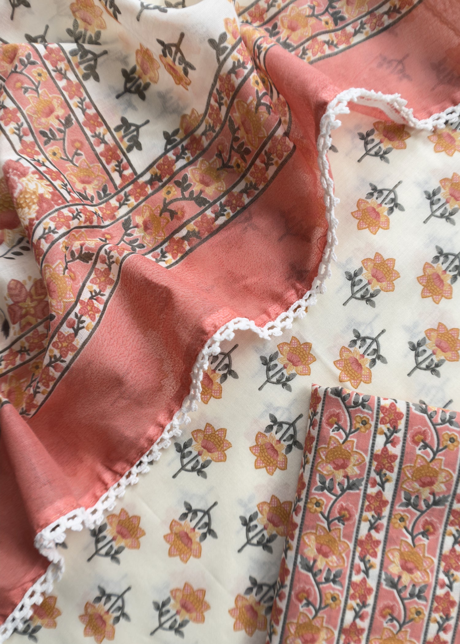 Get your hands on summer must haves three piece pure cotton hand block print suit with beautiful neckline and laces on borders.