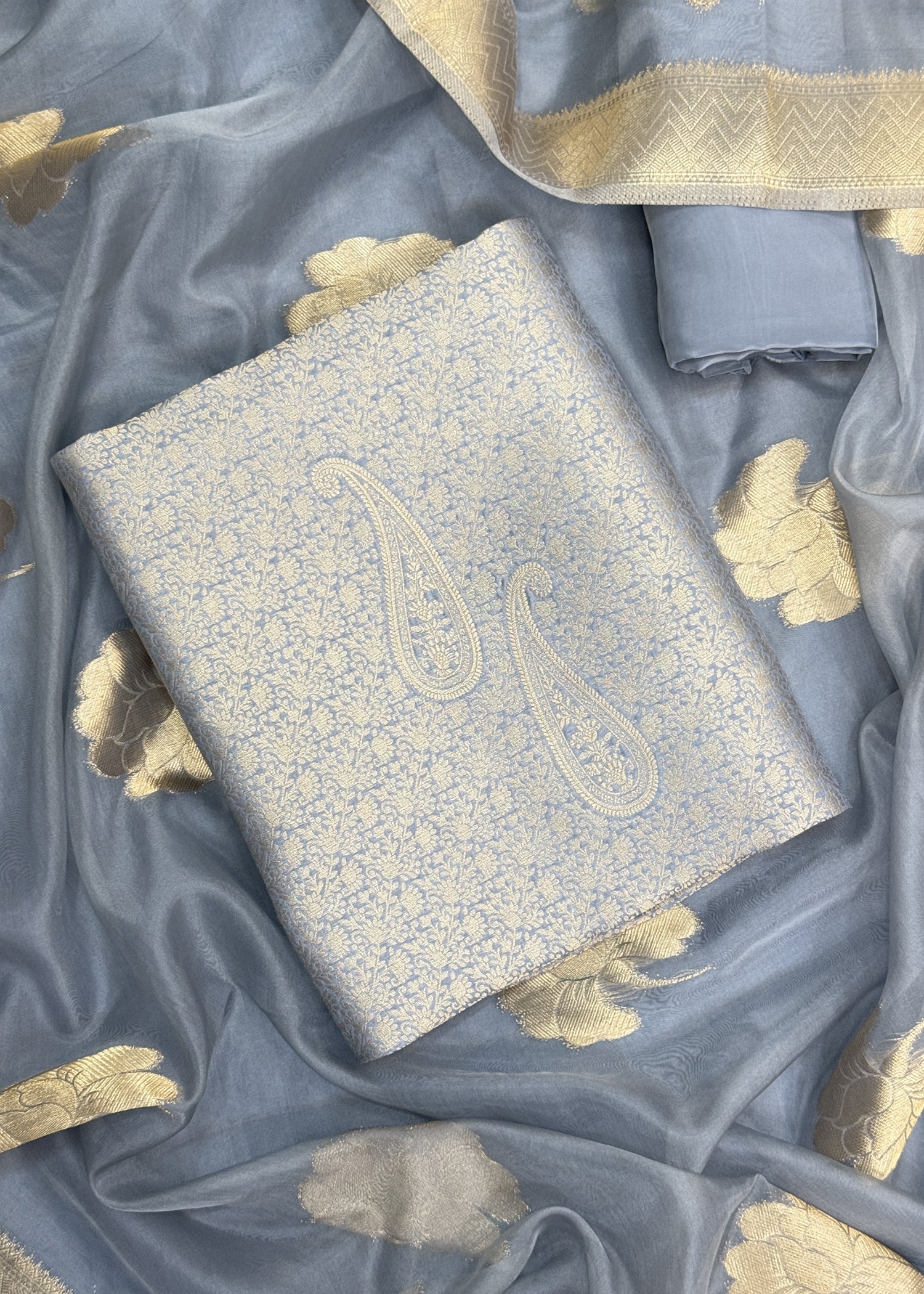 Gery Banarasi Silk Brocade Suit With Organza Dupatta