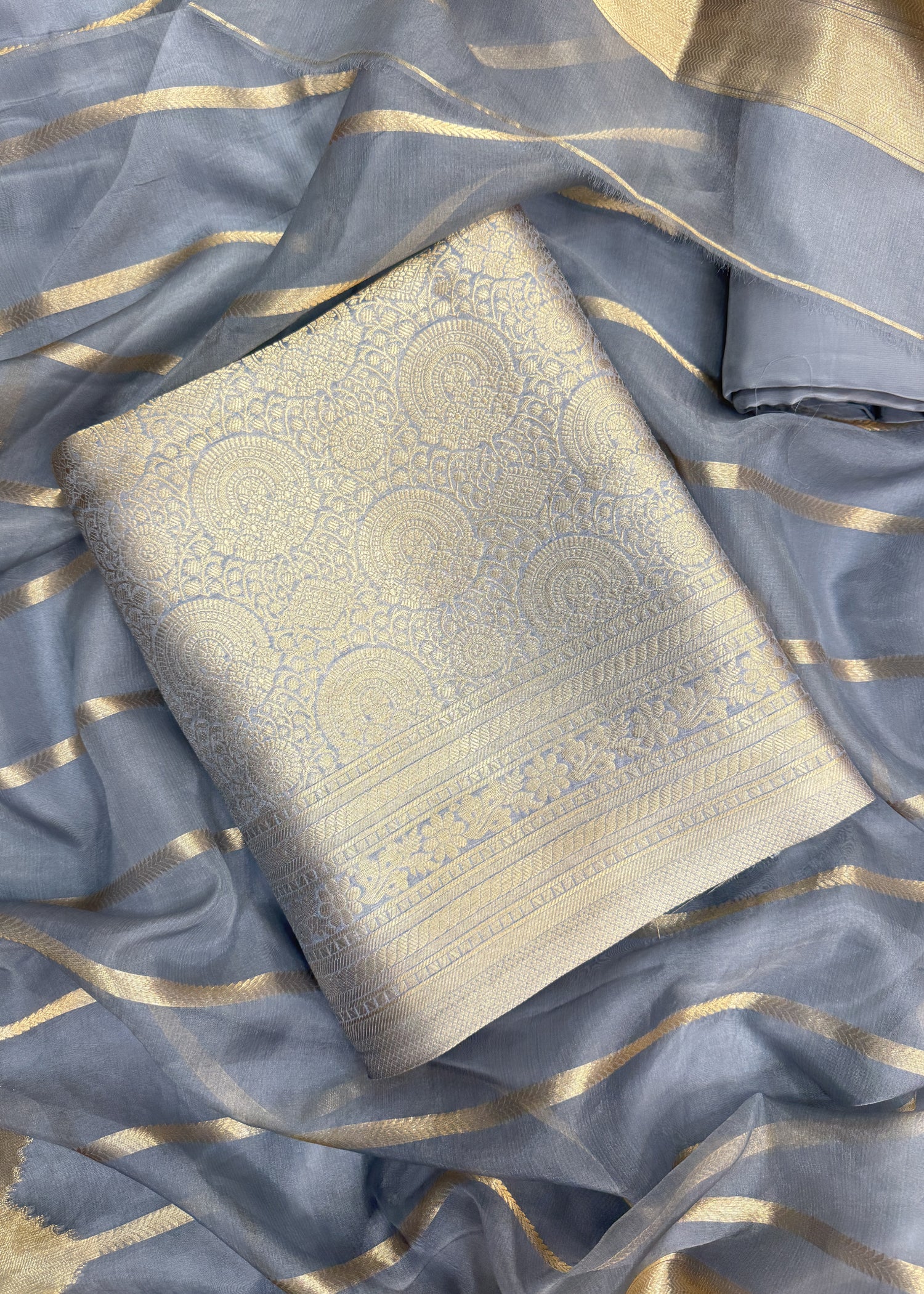 Gery Banarasi Silk Brocade Suit With Organza Dupatta