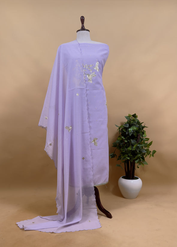 Modern elegant pure mulmul kurta and dupatta adorned with beautiful chidiya gold silver pitta handwork with minimal bootis, pretty gota laces and scalloping are paired with plain cotton satin lowers.