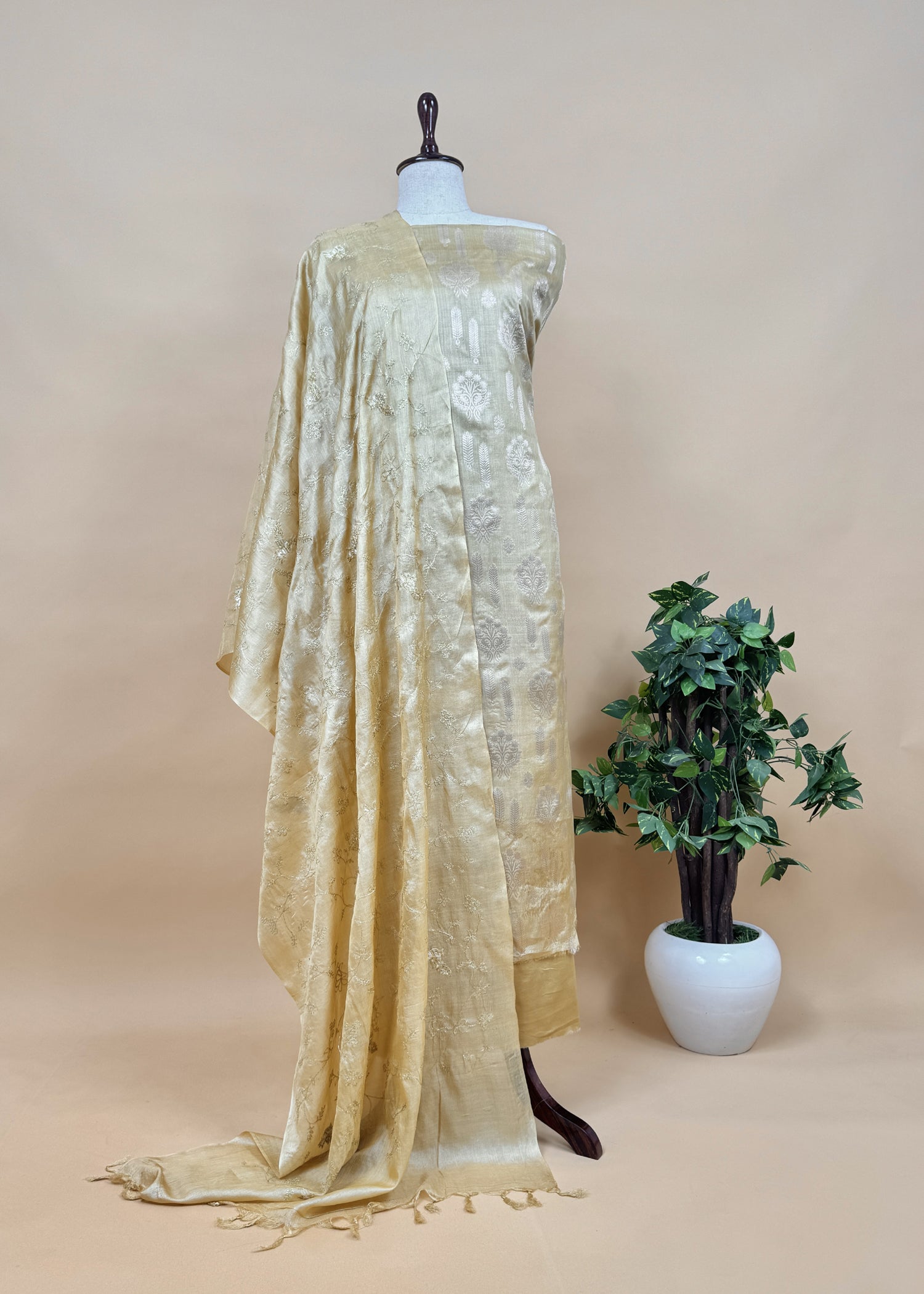 Golden Beige Munga Tussar Suit With Zanarasi Zari Weaving And Pitta Work