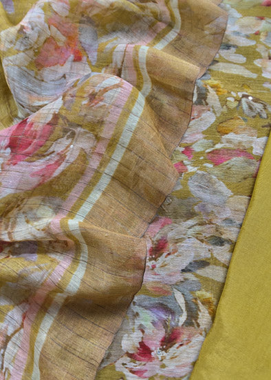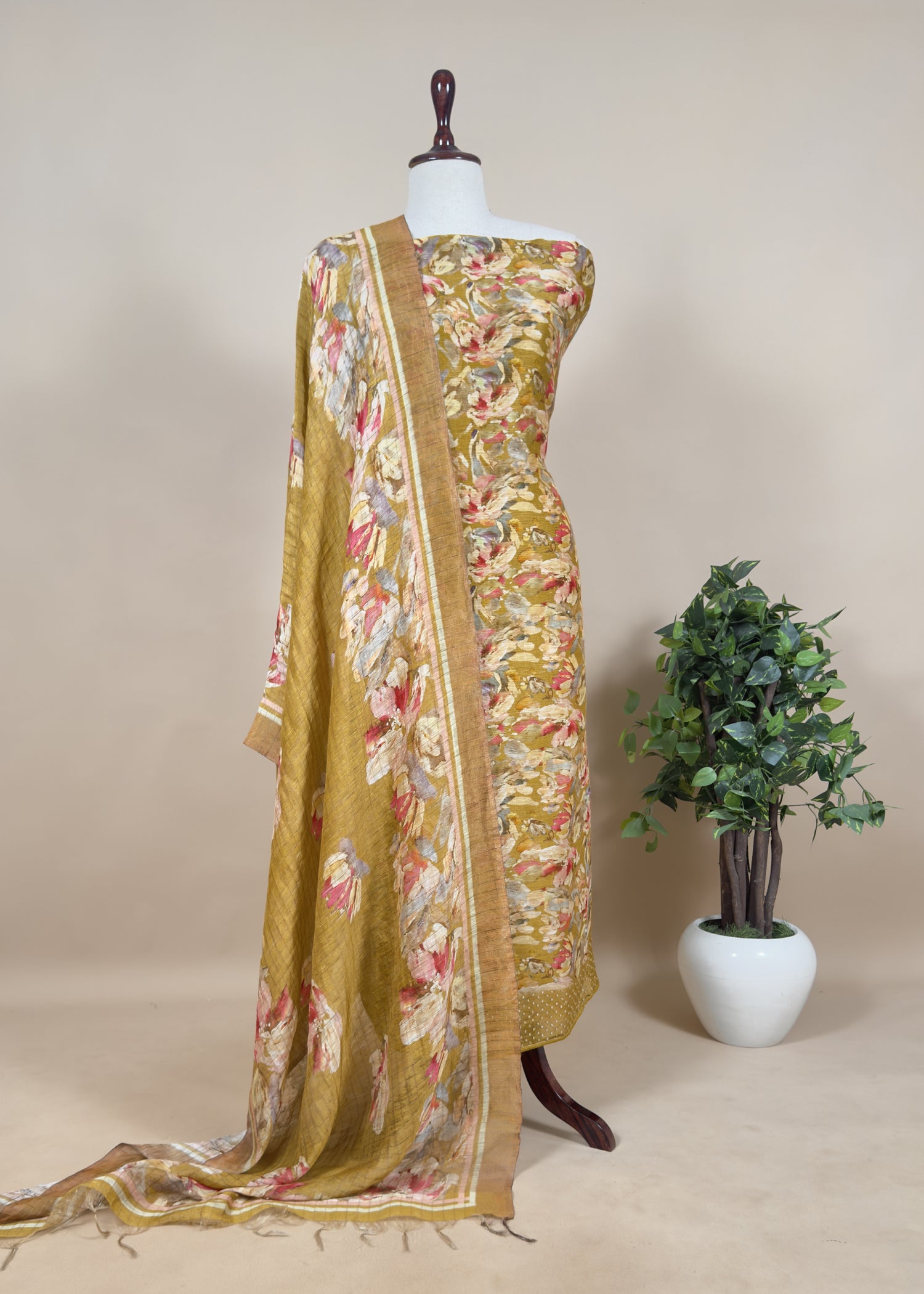 Golden Yellow Handloom Linen Silk Suit With Digital Print