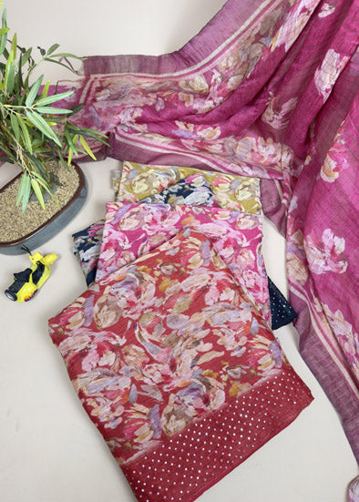 Step into elegance with this handwoven linen silk suits exquisitely embellished with beautiful digital print flowers and mirror work all over the kurta and ghera