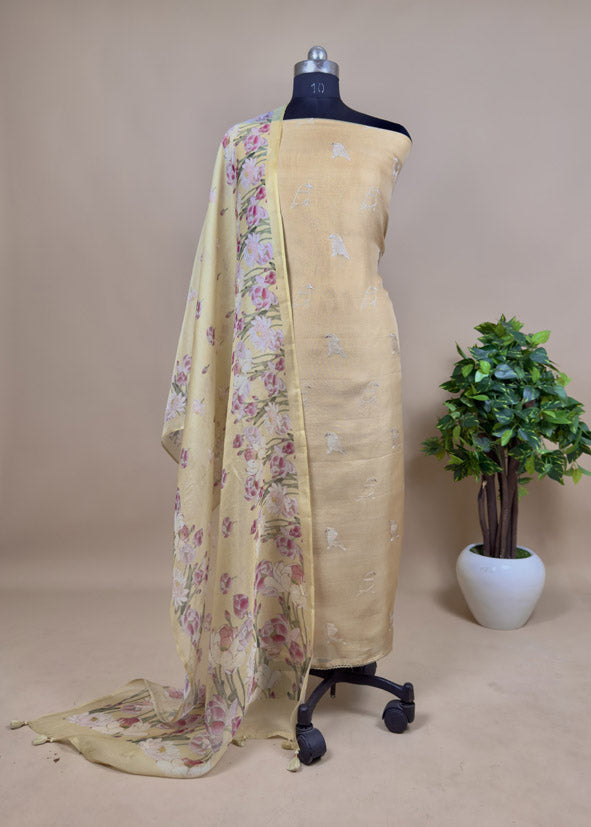 Golden Yellow Pure Organza Silk Unstitched Suit With Peonies Brush-Print Dupatta